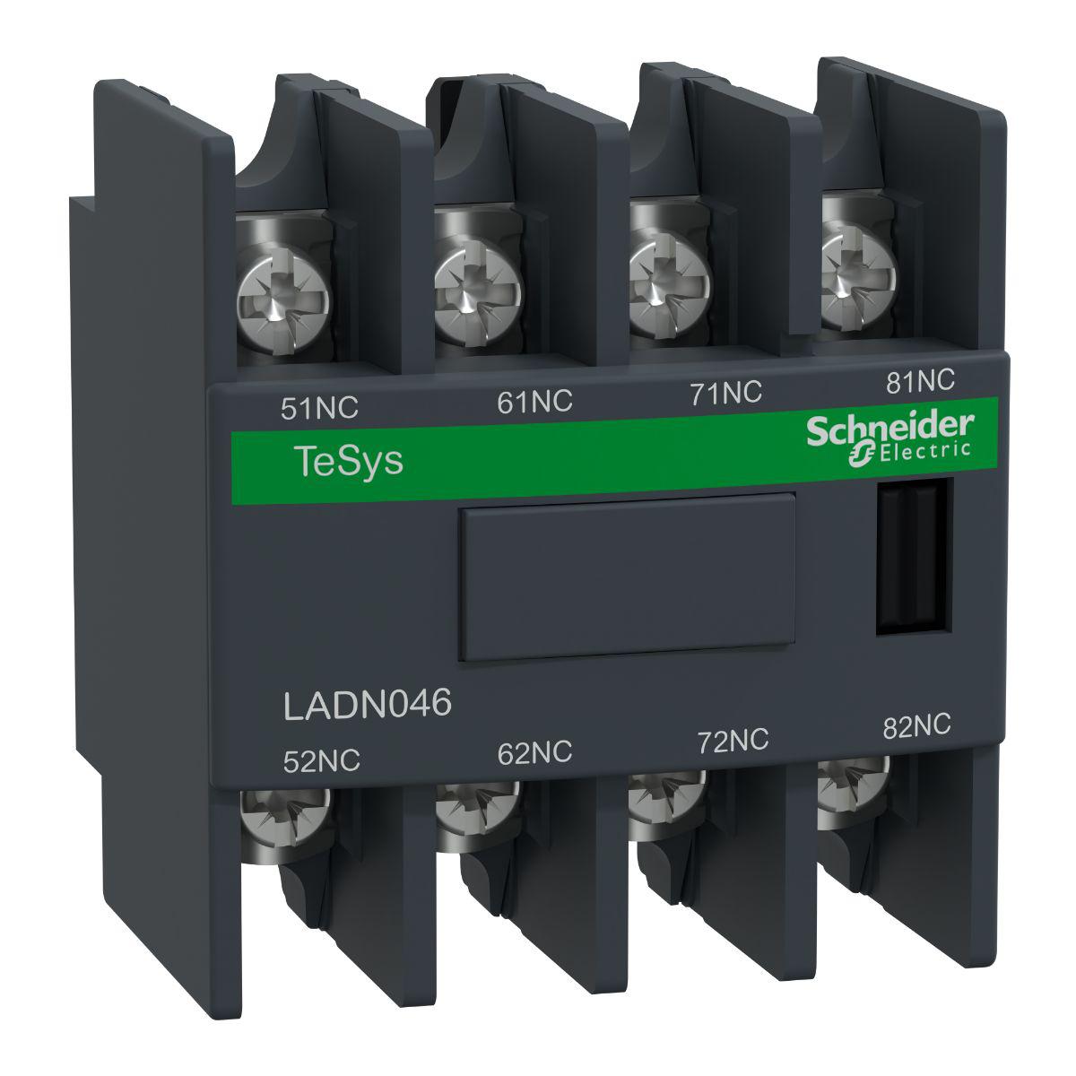 This is TeSys Auxiliary Contact Block - 4NC 4 Contact Front Mount 10 A manufactured by Schneider Electric. The manufacturer part number is LADN046. Better World Verification Options - green premium. Is it a better world product? yes. The rated contact current is 10 a. The product ladn, is a highly preferred choice for users. The product is available in front mount style. It features tesys range. The normal state configuration includes 4nc. The product contains 4 contacts.