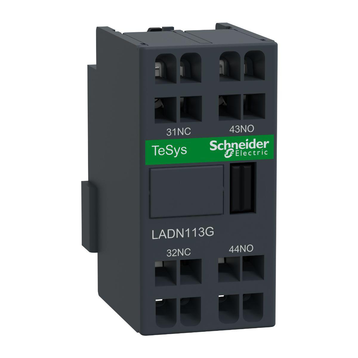 This is TeSys Auxiliary Contact Block - 1 NO + 1 NC 2 Contact Front Mount 10 A manufactured by Schneider Electric. The manufacturer part number is LADN113G. Better World Verification Options - green premium. Is it a better world product? yes. The rated contact current is 10 a. The product ladn, is a highly preferred choice for users. The product is available in front mount style. It features tesys range. The normal state configuration includes 1 no + 1 nc. The product contains 2 contacts.