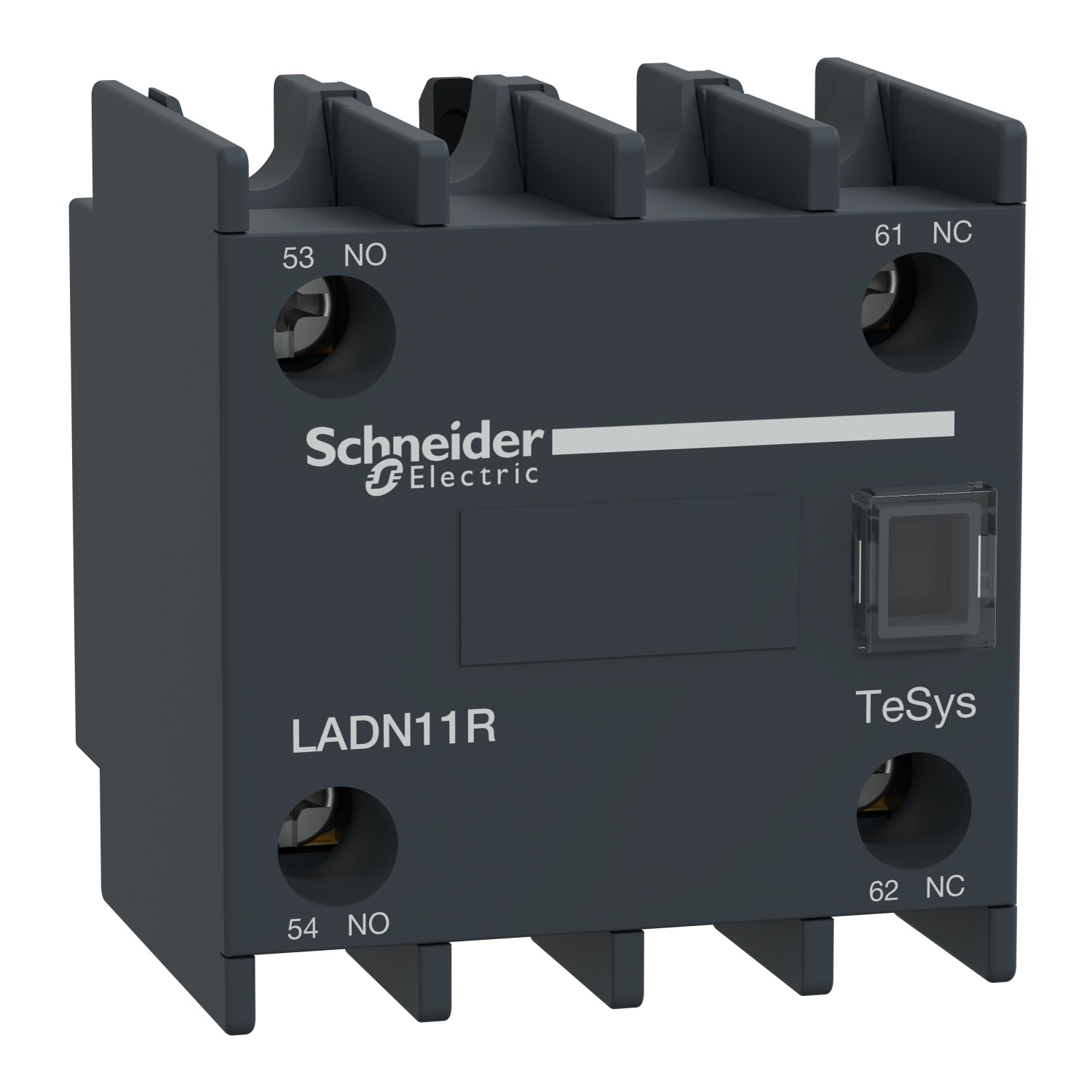 This is Auxiliary Contact Block 2 Contact NO/NC Screw Mount TeSys Deca LADN manufactured by Schneider Electric. The manufacturer part number is LADN11R. The product is available in screw mount style. The product tesys d, is a highly preferred choice for users. It features tesys deca range. The product contains 2 contacts. The normal state configuration includes no/nc.