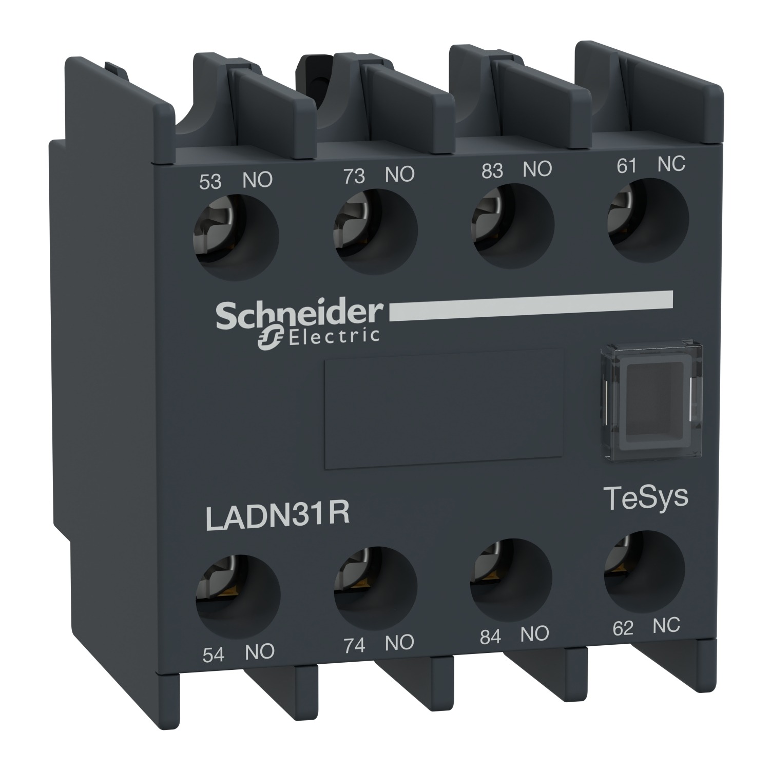 This is Auxiliary Contact Block 4 Contact 3NO/1NC Screw Mount TeSys Deca LADN manufactured by Schneider Electric. The manufacturer part number is LADN31R. The product is available in screw mount style. The product tesys d, is a highly preferred choice for users. It features tesys deca range. The product contains 4 contacts. The normal state configuration includes 3no/1nc.