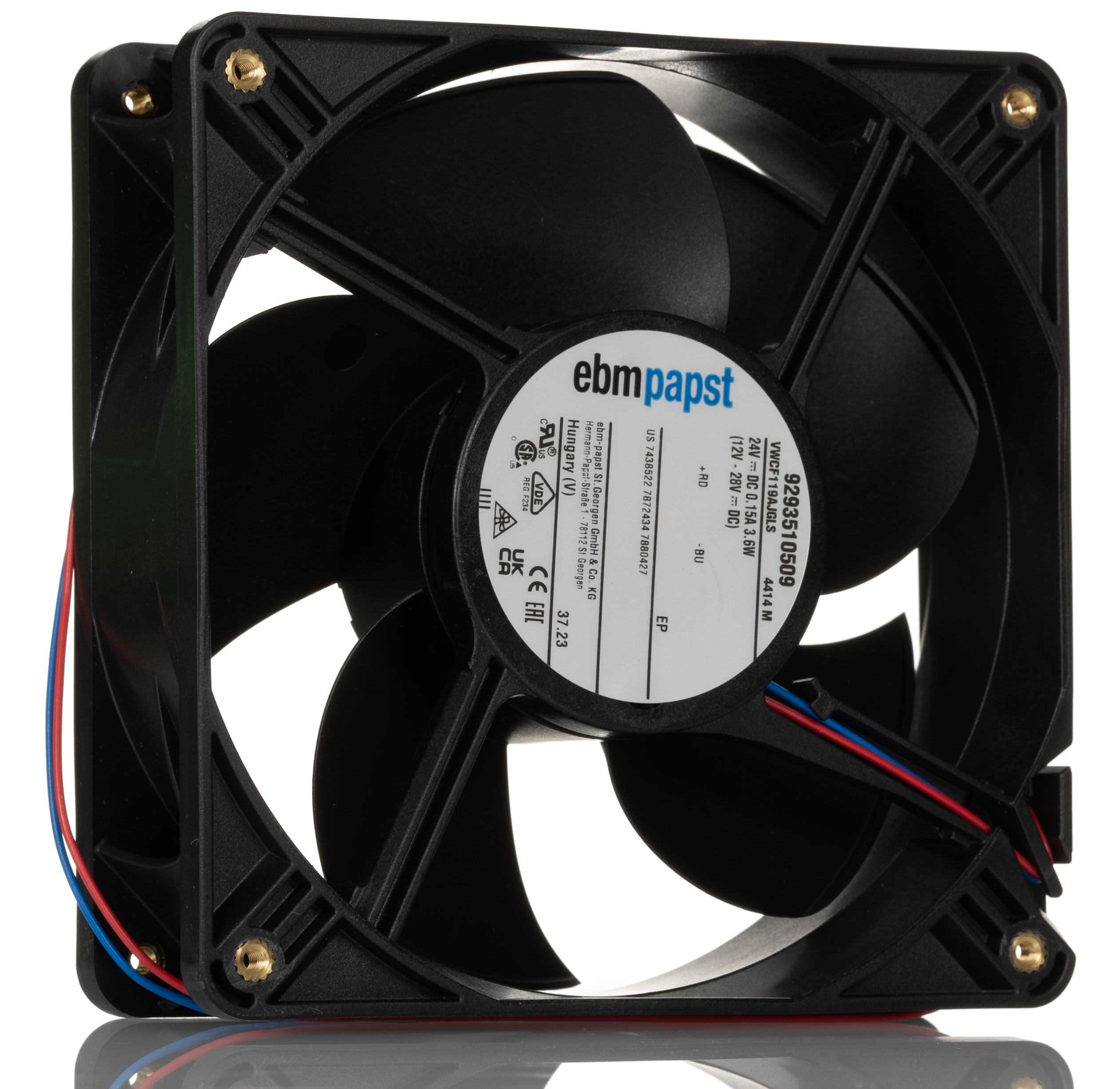 This is Axial Fan 119 x 119 x 38mm 184m³/h 4.1W 24 V dc (4414 M Series) manufactured by ebm-papst. The manufacturer part number is 4414M-RS0. The given dimensions of the product include 119 x 119 x 38mm. It features a noise level of 42db. It operates through dc. This has integrated with a ball, a bearing with long-lasting features. In addition, the height is 119mm. Furthermore, the product is 119mm wide. The product comes in 38mm depth. Its power consumption is approximately 3.6w . It has a 184m³/h air flow rate. Features 24 v dc supply voltage. The product is designed with a lead wire termination. Its fan speed is about 3300rpm .