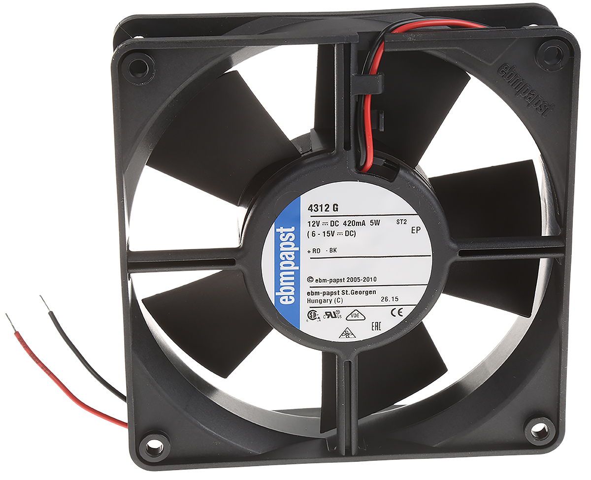 This is Axial Fan 119 x 119 x 32mm 166m³/h 4W 12 V dc (4300 Series) manufactured by ebm-papst. The manufacturer part number is 4312G. The given dimensions of the product include 119 x 119 x 32mm. It also carries 333ma maximum current. It features a noise level of 45db. It operates through dc. This has integrated with a sleeve, a bearing with long-lasting features. In addition, the height is 119mm. Furthermore, the product is 119mm wide. The product comes in 32mm depth. Its power consumption is approximately 5w . It has a 170m³/h air flow rate. Features 12 v dc supply voltage. Its fan speed is about 2800rpm .