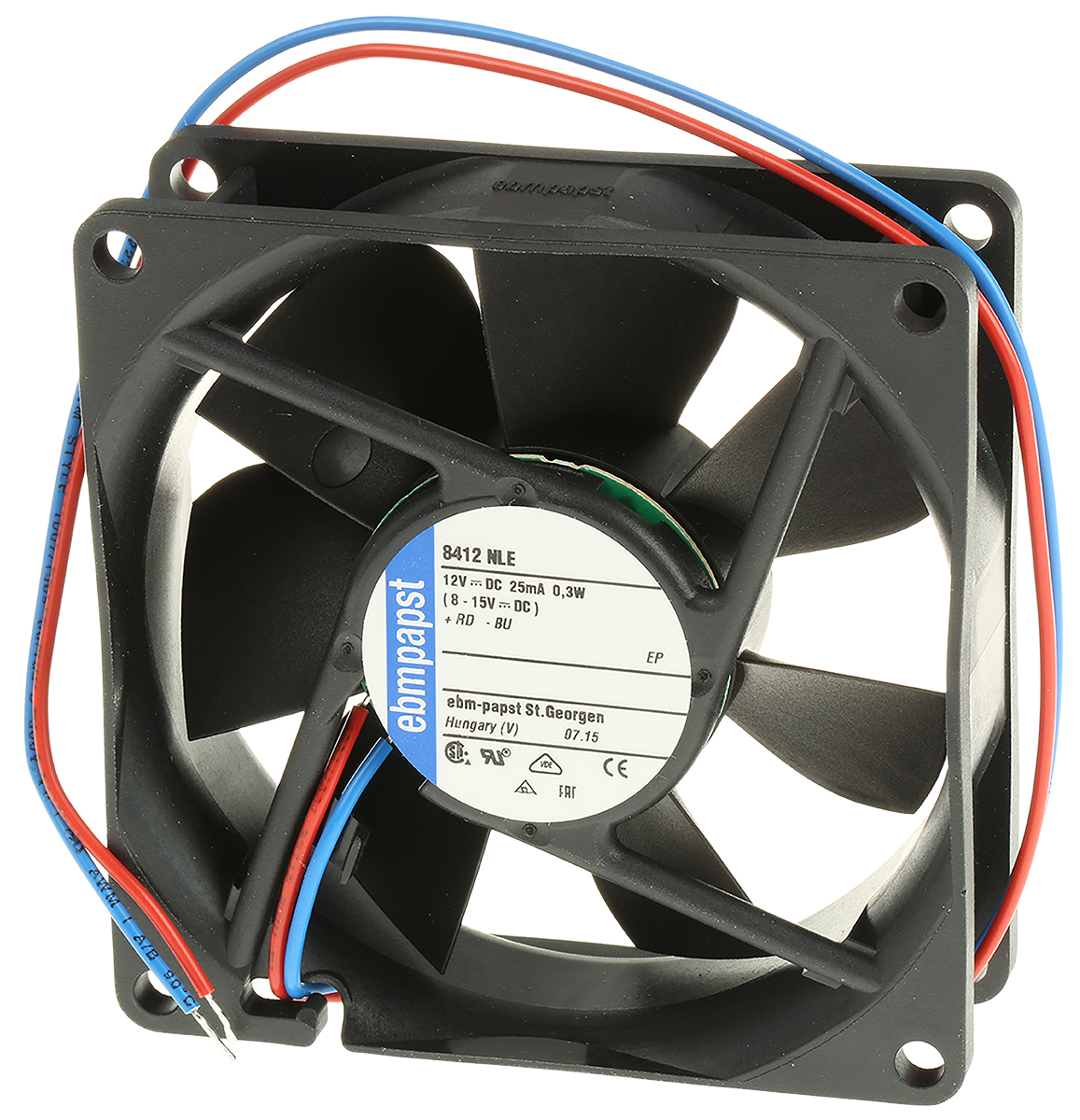 This is DC Axial Fan 80 x 80 x 25mm 33m³/h 0.3W 12 V dc (8400N Series) manufactured by ebm-papst. The manufacturer part number is 8412NLE. The given dimensions of the product include 80 x 80 x 25mm. It also carries 25ma maximum current. It features a noise level of 17db. It operates through dc. This has integrated with a ball, a bearing with long-lasting features. In addition, the height is 80mm. Furthermore, the product is 80mm wide. The product comes in 25mm depth. Its power consumption is approximately 300mw . It has a 33m³/h air flow rate. Features 12 v dc supply voltage. Its fan speed is about 1500rpm .