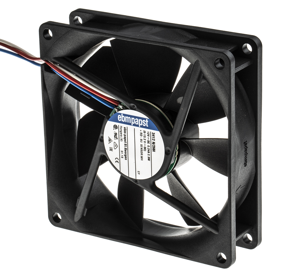 This is DC Axial Fan 92 x 92 x 25mm 102m³/h 2.9W 12 V dc (3412N Series) manufactured by ebm-papst. The manufacturer part number is 3412N/2HH. The given dimensions of the product include 92 x 92 x 25mm. It features a noise level of 39db. It operates through dc. This has integrated with a ball, a bearing with long-lasting features. In addition, the height is 92mm. Furthermore, the product is 92mm wide. The product comes in 25mm depth. Its power consumption is approximately 2.9w . It has a 102m³/h air flow rate. Features 12 v dc supply voltage. Its fan speed is about 3250rpm . These sensors are sort of tachometer.