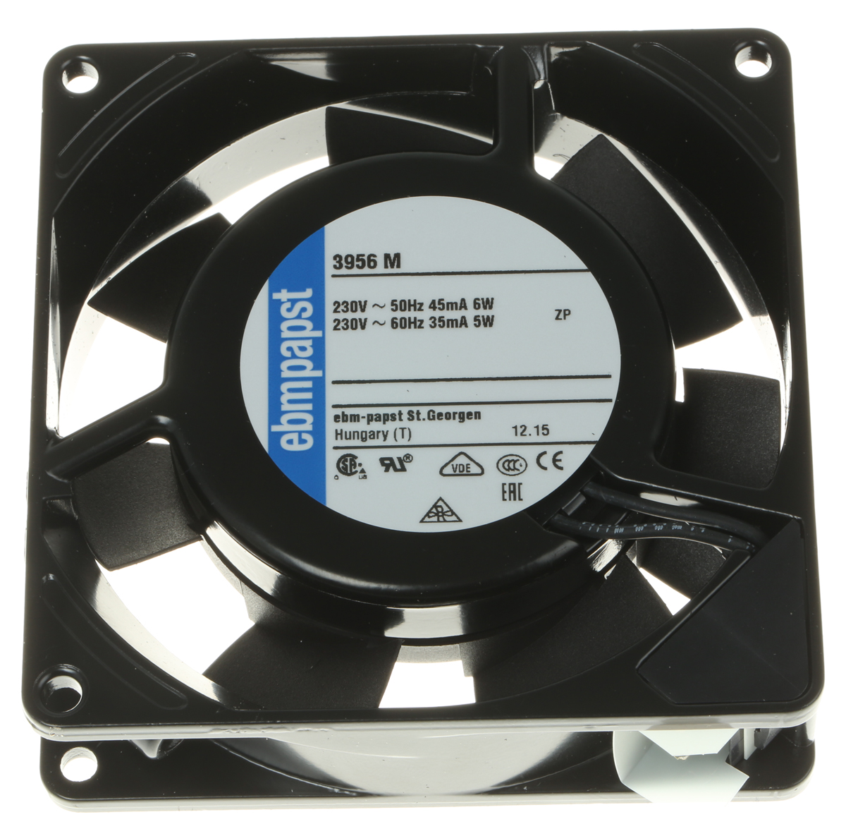 This is Axial Fan 92 x 92 x 25.4mm 45m³/h 6W 230 V ac (3900 Series) manufactured by ebm-papst. The manufacturer part number is 3956M. The given dimensions of the product include 92 x 92 x 25mm. It also carries 26ma maximum current. It features a noise level of 29db. It operates through ac. This has integrated with a ball, a bearing with long-lasting features. In addition, the height is 92mm. Furthermore, the product is 92mm wide. The product comes in 25.4mm depth. Its power consumption is approximately 6w . It has a 45m³/h air flow rate. Features 230 v ac supply voltage. Its fan speed is about 2150rpm .
