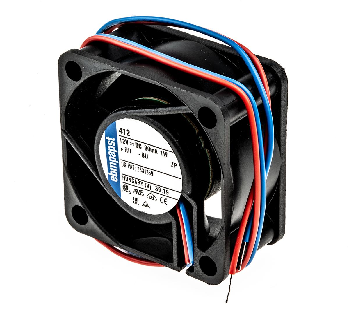 This is DC Axial Fan 40 x 40 x 20mm 10m³/h 0.9W 12 V dc (400 Series) manufactured by ebm-papst. The manufacturer part number is 412. The given dimensions of the product include 40 x 40 x 20mm. It also carries 67ma maximum current. It features a noise level of 18db. It operates through dc. This has integrated with a sleeve, a bearing with long-lasting features. In addition, the height is 40mm. Furthermore, the product is 40mm wide. The product comes in 20mm depth. Its power consumption is approximately 800mw . It has a 10m³/h air flow rate. Features 12 v dc supply voltage. Its fan speed is about 6000rpm .