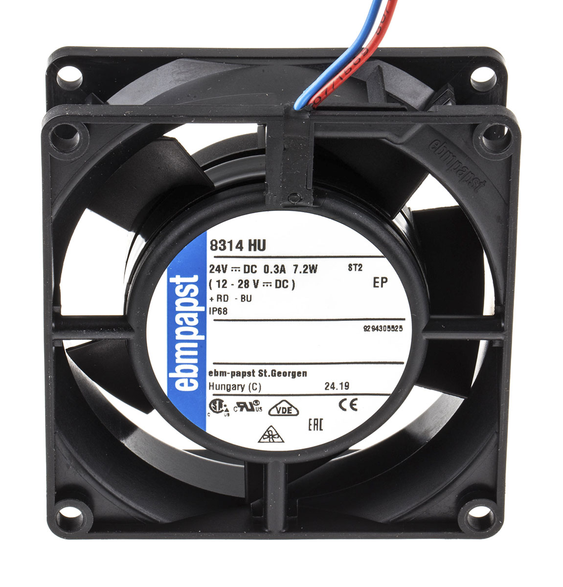 This is Axial Fan 80 x 80 x 32mm 80m³/h 6W 24 V dc (8300 Series) manufactured by ebm-papst. The manufacturer part number is 8314HU. The given dimensions of the product include 80 x 80 x 32mm. It is IP rated with ip68. It features a noise level of 48db. This has integrated with a ball, a bearing with long-lasting features. In addition, the height is 80mm. Furthermore, the product is 80mm wide. The product comes in 32mm depth. Its power consumption is approximately 6w . It has a 80m³/h air flow rate. Features 24 v dc supply voltage. Its fan speed is about 5000rpm . It operates through dc.