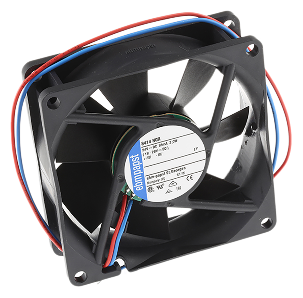 This is Axial Fan 80 x 80 x 25mm 69m³/h 2W 24 V dc (8400N Series) manufactured by ebm-papst. The manufacturer part number is 8414NGR. The given dimensions of the product include 80 x 80 x 25mm. It also carries 83ma maximum current. It features a noise level of 32db. It operates through dc. This has integrated with a sleeve, a bearing with long-lasting features. In addition, the height is 80mm. Furthermore, the product is 80mm wide. The product comes in 25mm depth. Its power consumption is approximately 2w . It has a 69m³/h air flow rate. Features 24 v dc supply voltage. Its fan speed is about 3100rpm .