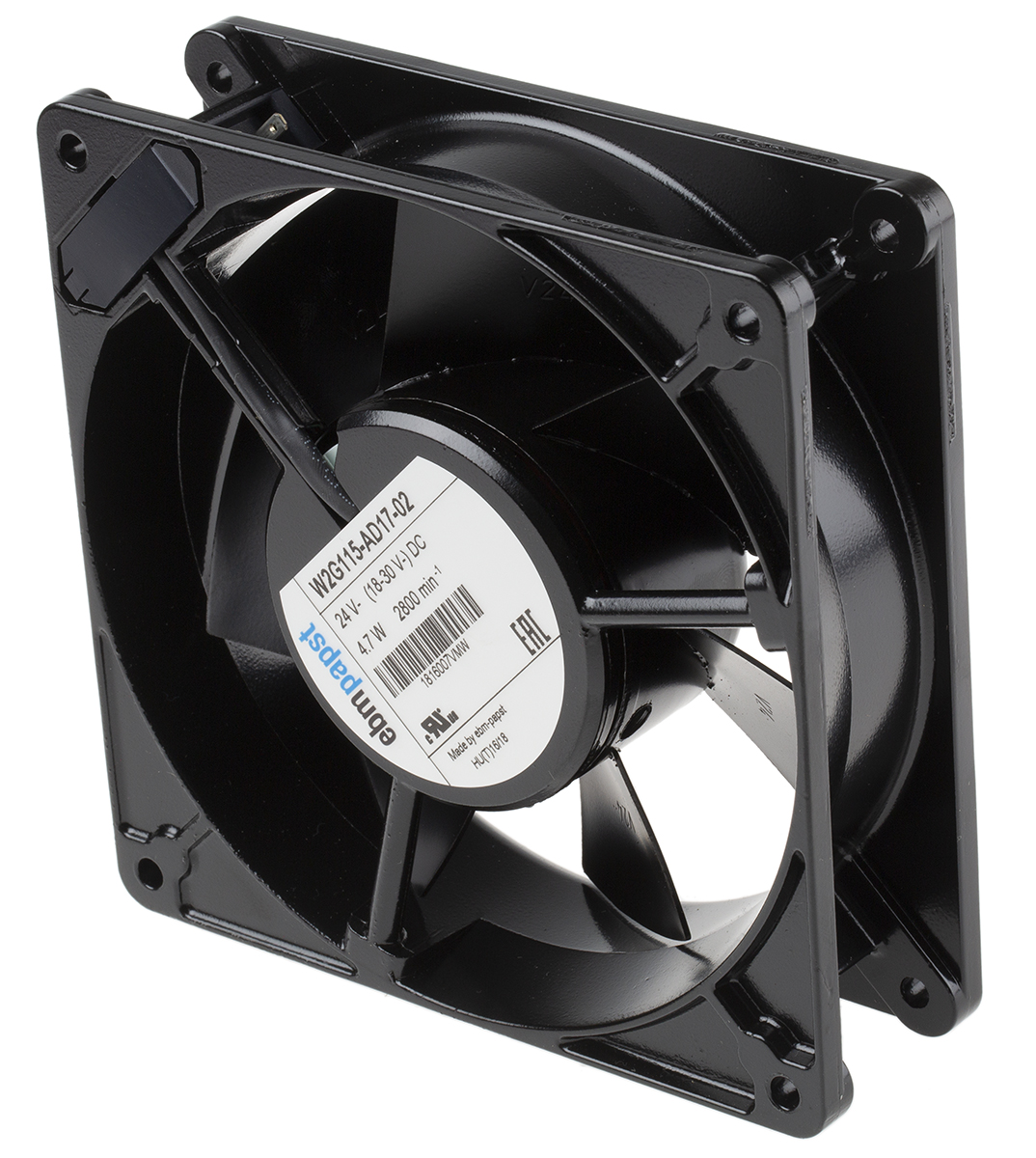 This is DC Axial Fan 127 x 127 x 38mm 200m³/h 4.7W 24 V dc (W2G115 Series) manufactured by ebm-papst. The manufacturer part number is W2G115-AD17-02. The given dimensions of the product include 127 x 127 x 38mm. It also carries 196ma maximum current. It features a noise level of 44db. It operates through dc. This has integrated with a ball, a bearing with long-lasting features. In addition, the height is 127mm. Furthermore, the product is 127mm wide. The product comes in 38mm depth. Its power consumption is approximately 4.7w . It has a 245m³/h air flow rate. Features 24 v dc supply voltage. Its fan speed is about 2800rpm .