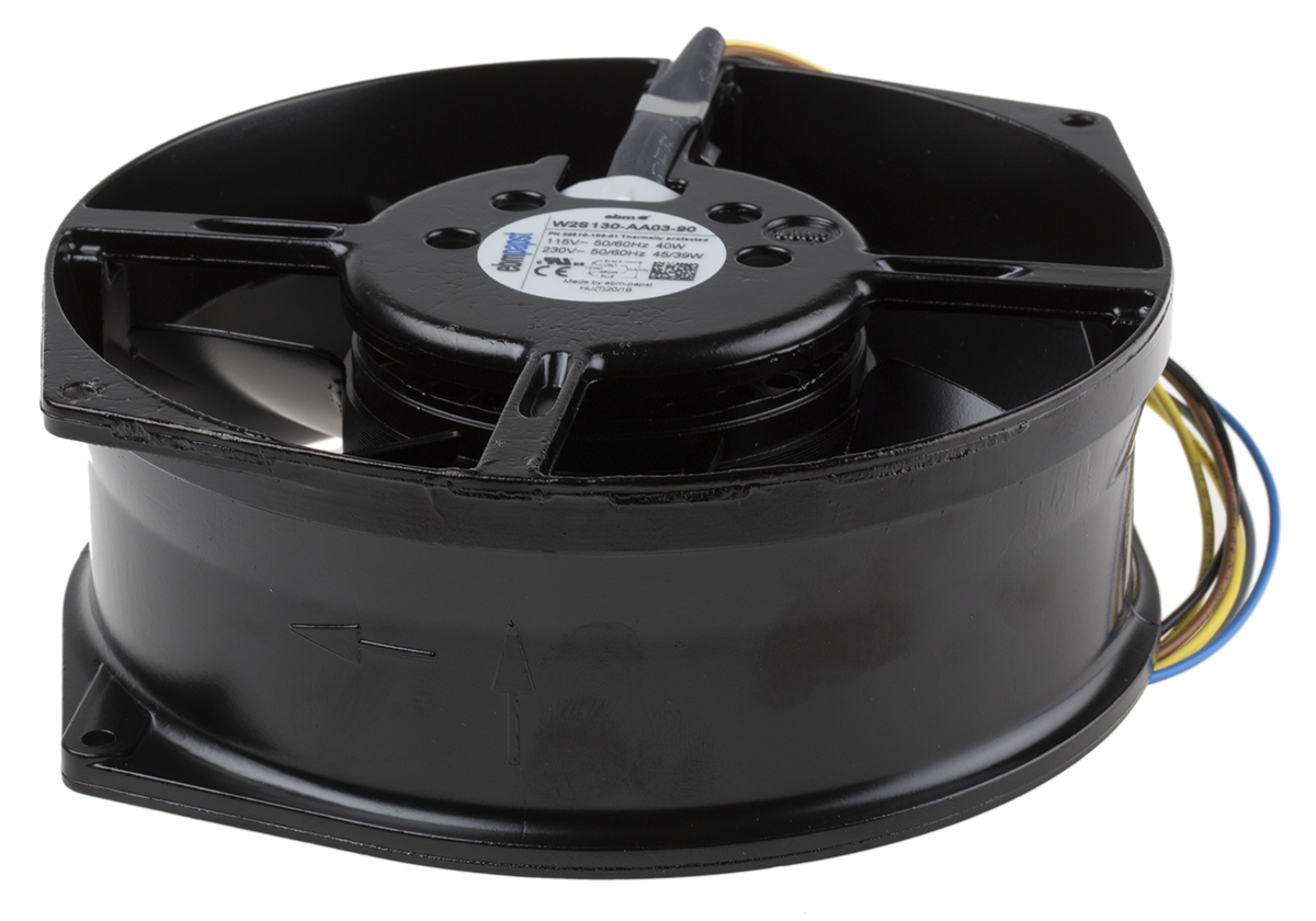 This is Axial Fan 172x 55mm 380m³/h 45W 230 V ac (W2S130 Series) manufactured by ebm-papst. The manufacturer part number is W2S130-AA03-90. The given dimensions of the product include 172 x 55mm. It features a noise level of 53db. It operates through ac. This has integrated with a ball, a bearing with long-lasting features. In addition, the height is 172mm. The product comes in 55mm depth. Its power consumption is approximately 45w . It has a 380m³/h air flow rate. Features 230 v ac supply voltage. Its fan speed is about 3250rpm . Its direction of curve is in backward .