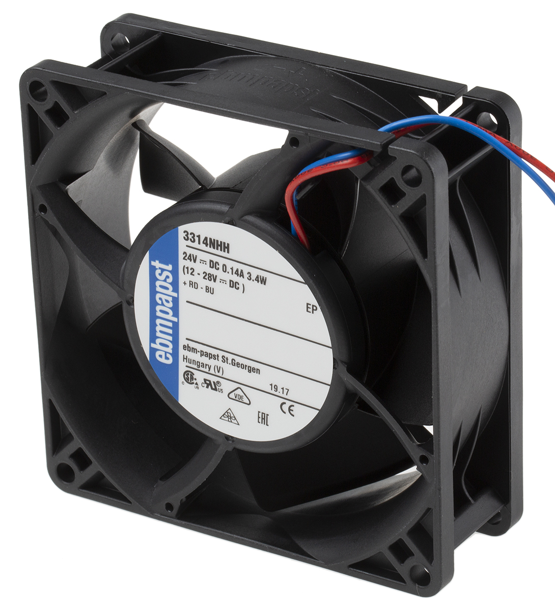 This is DC Axial Fan 92 x 92 x 32mm 107m³/h 3.5W 24 V dc (3300N Series) manufactured by ebm-papst. The manufacturer part number is 3314NHH. The given dimensions of the product include 92 x 92 x 32mm. It features a noise level of 42db. It operates through dc. This has integrated with a ball, a bearing with long-lasting features. In addition, the height is 92mm. Furthermore, the product is 92mm wide. The product comes in 32mm depth. Its power consumption is approximately 3.5w . It has a 107m³/h air flow rate. Features 24 v dc supply voltage. The product is designed with a lead wire termination. Its fan speed is about 3450rpm .