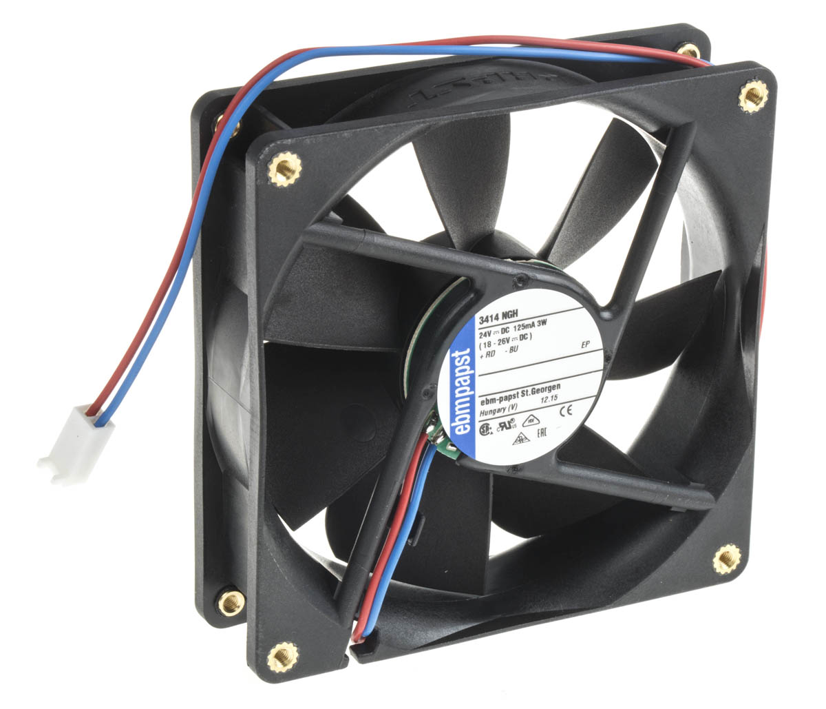 This is Axial Fan 92 x 92 x 25mm 94m³/h 3W 24 V dc (3400N Series) manufactured by ebm-papst. The manufacturer part number is 3414NGH-RS0. The given dimensions of the product include 92 x 92 x 25mm. It features a noise level of 36db. It operates through dc. This has integrated with a sleeve, a bearing with long-lasting features. In addition, the height is 92mm. Furthermore, the product is 92mm wide. The product comes in 25mm depth. Its power consumption is approximately 3w . It has a 94m³/h air flow rate. Features 24 v dc supply voltage. Its fan speed is about 3000rpm .