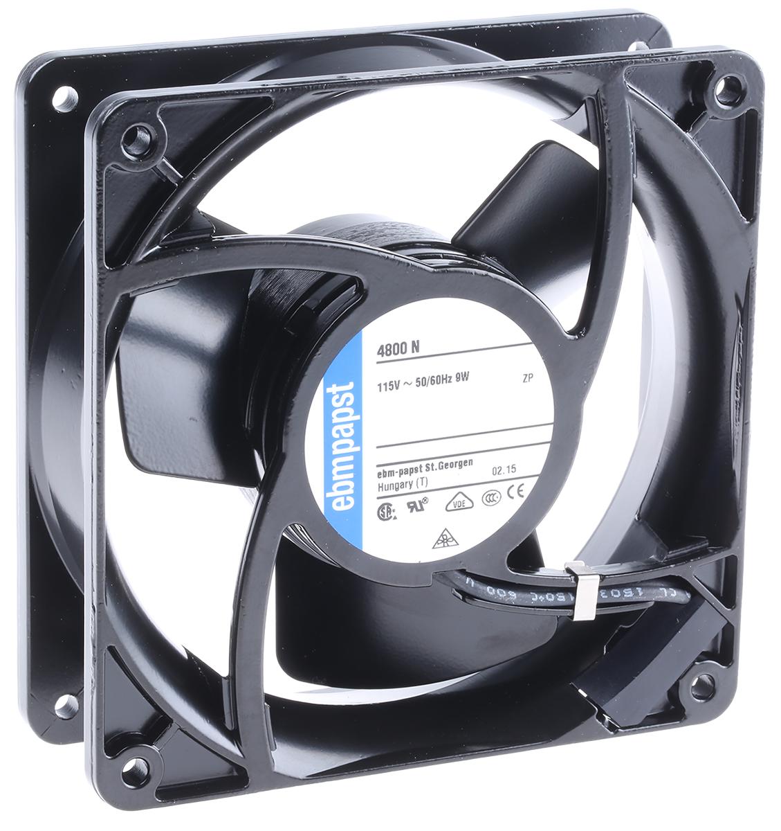 This is Axial Fan 119 x 119 x 38mm 97m³/h 9W 115 V ac (4000N Series) manufactured by ebm-papst. The manufacturer part number is 4800N. The given dimensions of the product include 119 x 119 x 38mm. It also carries 78.3ma maximum current. It features a noise level of 32db. It operates through ac. This has integrated with a sleeve, a bearing with long-lasting features. In addition, the height is 119mm. Furthermore, the product is 119mm wide. The product comes in 38mm depth. Its power consumption is approximately 9w . It has a 97m³/h air flow rate. Features 115 v ac supply voltage. Its fan speed is about 1750rpm .