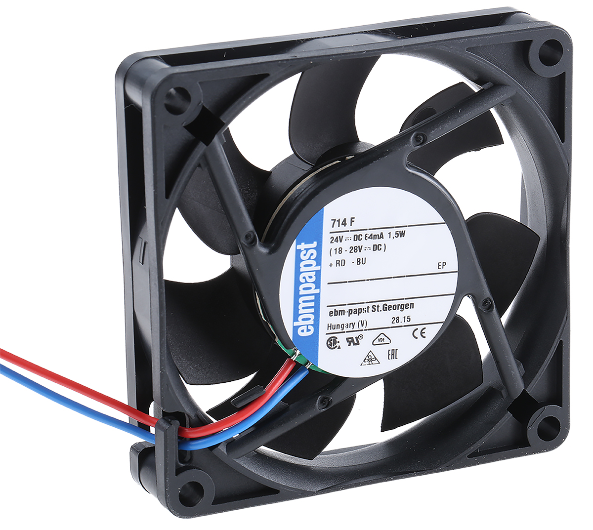 This is Axial Fan 70 x 70 x 15mm 44m³/h 1.5W 24 V dc (700F Series) manufactured by ebm-papst. The manufacturer part number is 714F. The given dimensions of the product include 70 x 70 x 15mm. It also carries 63ma maximum current. It features a noise level of 38db. It operates through dc. This has integrated with a sleeve, a bearing with long-lasting features. In addition, the height is 70mm. Furthermore, the product is 70mm wide. The product comes in 15mm depth. Its power consumption is approximately 1.5w . It has a 44m³/h air flow rate. Features 24 v dc supply voltage. Its fan speed is about 5300rpm .