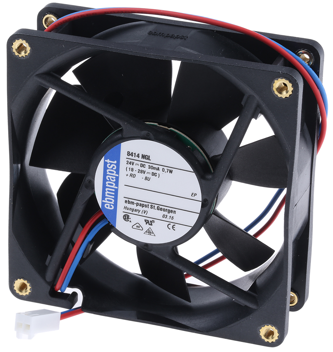This is Axial Fan 80 x 80 x 25mm 33m³/h 700mW 24 V dc (8400N Series) manufactured by ebm-papst. The manufacturer part number is 8414NGL-RS0. The given dimensions of the product include 80 x 80 x 25mm. It features a noise level of 12db. It operates through dc. This has integrated with a sleeve, a bearing with long-lasting features. In addition, the height is 80mm. Furthermore, the product is 80mm wide. The product comes in 25mm depth. Its power consumption is approximately 700mw . It has a 33m³/h air flow rate. Features 24 v dc supply voltage. Its fan speed is about 1500rpm .