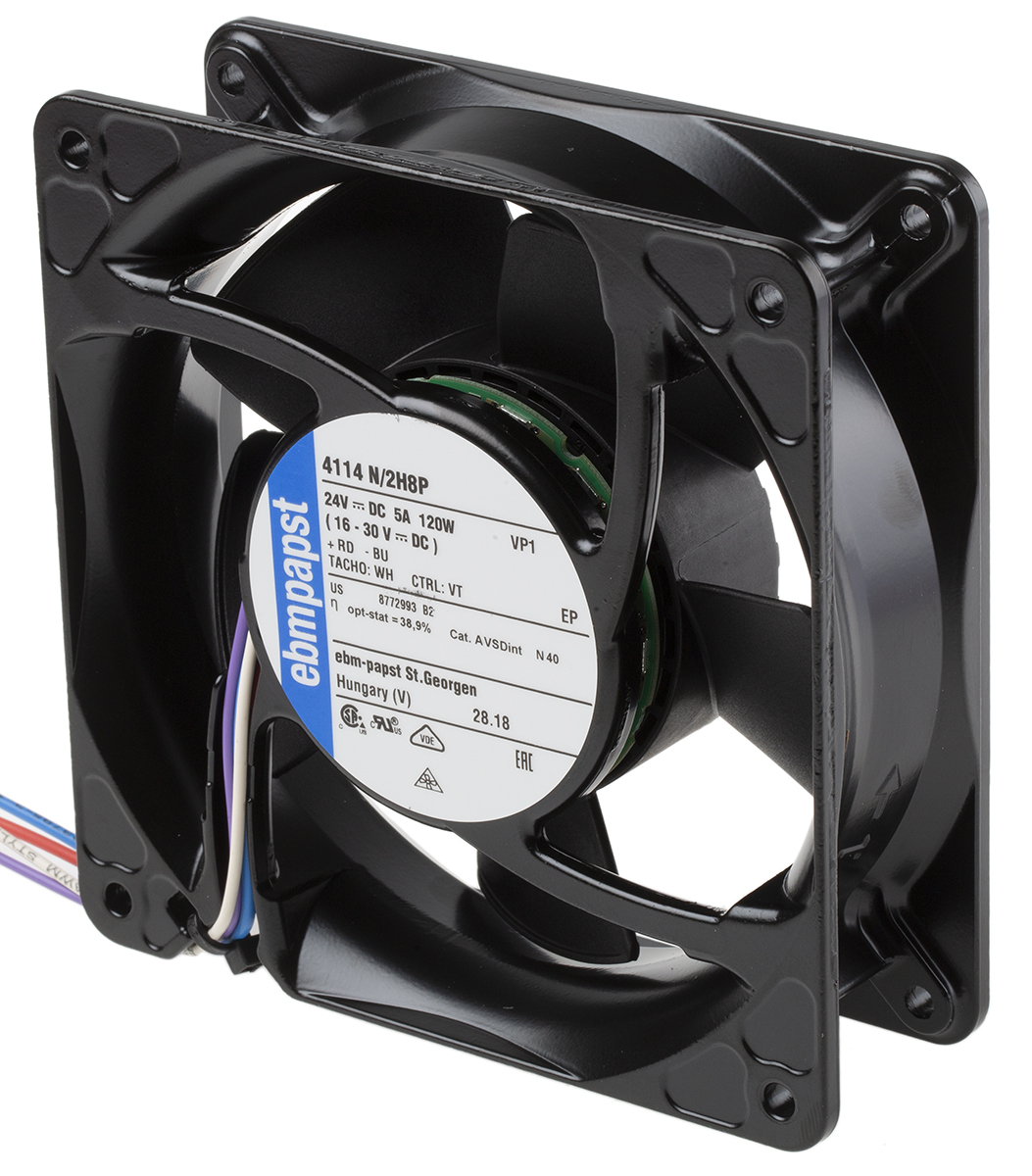 This is Axial Fan 119 x 119 x 38mm 570m³/h 120W 24 V dc (4100N Series) manufactured by ebm-papst. The manufacturer part number is 4114N/2H8P. The given dimensions of the product include 119 x 119 x 38mm. It is IP rated with ip20. It features a noise level of 78db. This has integrated with a ball, a bearing with long-lasting features. In addition, the height is 119mm. Furthermore, the product is 119mm wide. The product comes in 38mm depth. Its power consumption is approximately 120w . It has a 570m³/h air flow rate. Features 24 v dc supply voltage. Its fan speed is about 11000rpm . It operates through dc. These sensors are sort of pwm, tachometer.
