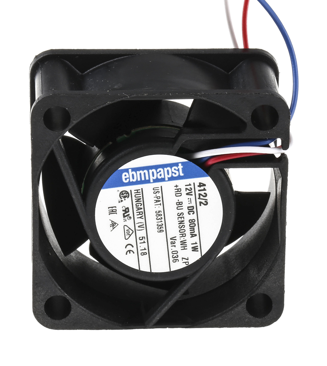 This is Axial Fan 40 x 40 x 20mm 10m³/h 900mW 12 V dc (400 Series) manufactured by ebm-papst. The manufacturer part number is 412/2-036. The given dimensions of the product include 40 x 40 x 20mm. It features a noise level of 20db. It operates through dc. This has integrated with a sleeve, a bearing with long-lasting features. In addition, the height is 40mm. Furthermore, the product is 40mm wide. The product comes in 20mm depth. Its power consumption is approximately 1w . It has a 10m³/h air flow rate. Features 12 v dc supply voltage. Its fan speed is about 6000rpm . These sensors are sort of tachometer.