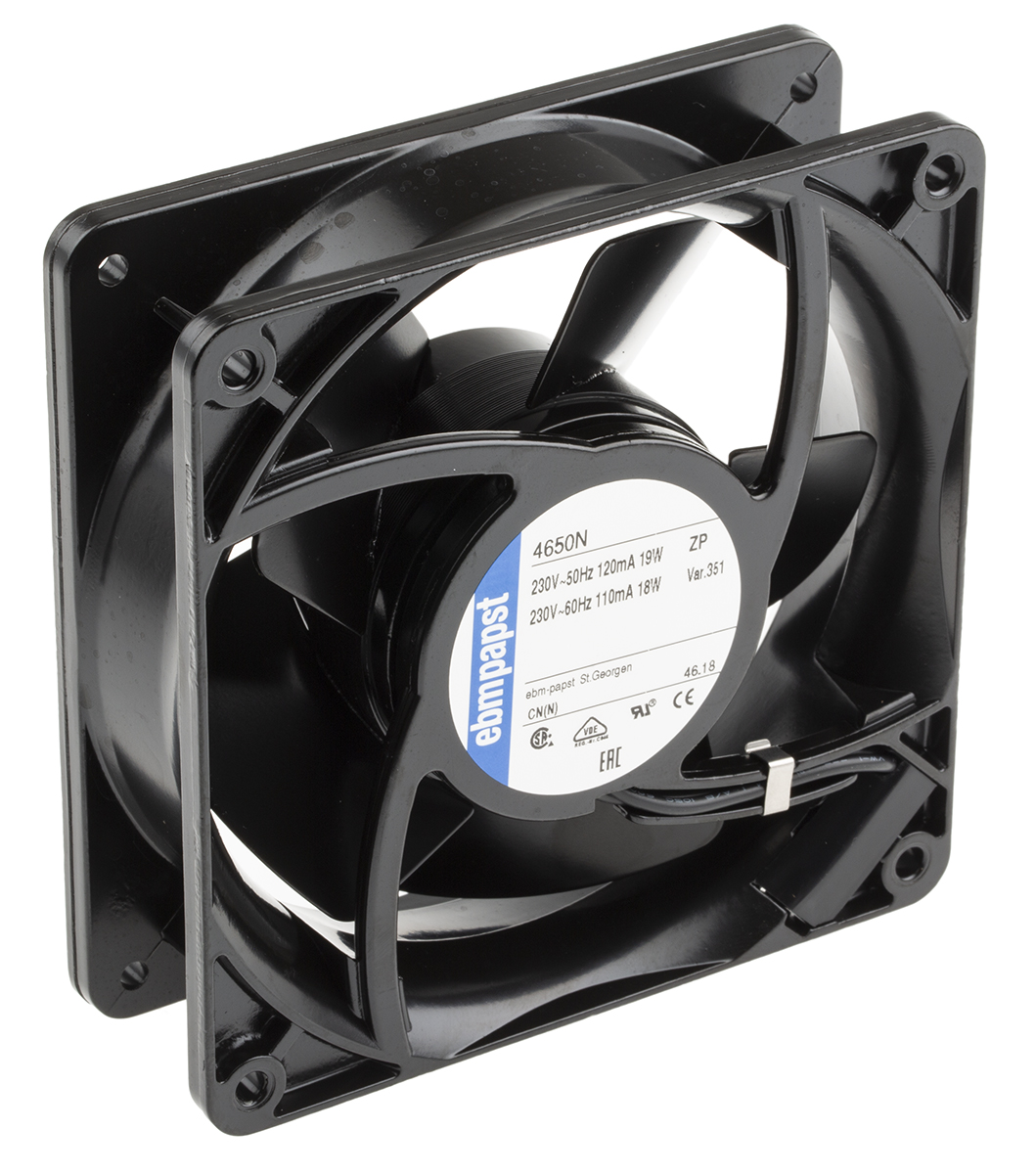 This is AC Axial Fan 119 x 119 x 38mm 160m³/h 19W 230 V ac (4000N Series) manufactured by ebm-papst. The manufacturer part number is 4650N. The given dimensions of the product include 119 x 119 x 38mm. It also carries 83ma maximum current. It is IP rated with ip20. It features a noise level of 46db. This has integrated with a sleeve, a bearing with long-lasting features. In addition, the height is 119mm. Furthermore, the product is 119mm wide. The product comes in 38mm depth. Its power consumption is approximately 19w . It has a 160m³/h air flow rate. Features 230 v ac supply voltage. Its fan speed is about 2650rpm . The product is designed with a flat plug termination. It operates through ac.
