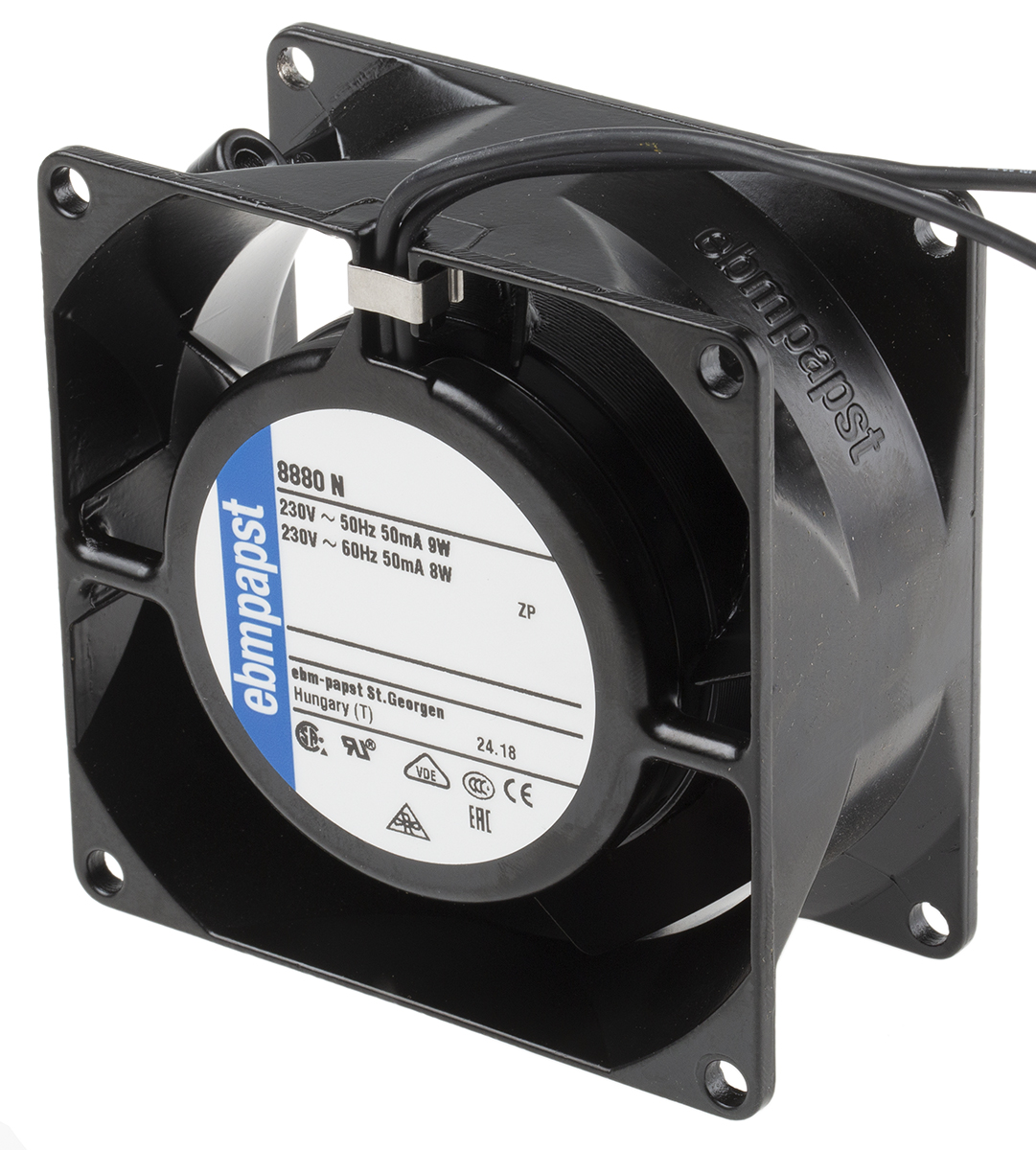This is AC Axial Fan 80 x 80 x 38mm 30m³/h 9W 230 V ac (8000N Series) manufactured by ebm-papst. The manufacturer part number is 8880N. The given dimensions of the product include 80 x 80 x 38mm. It also carries 39ma maximum current. It features a noise level of 18db. It operates through ac. This has integrated with a sleeve, a bearing with long-lasting features. In addition, the height is 80mm. Furthermore, the product is 80mm wide. The product comes in 38mm depth. Its power consumption is approximately 9w . It has a 30m³/h air flow rate. Features 230 v ac supply voltage. Its fan speed is about 1750rpm .