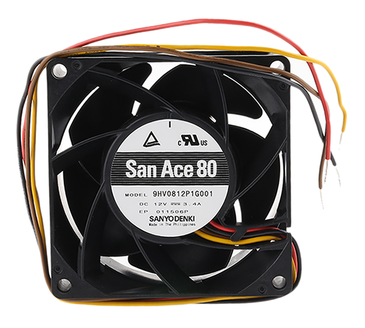 This is DC Axial Fan 80 x 80 x 38mm 222m³/h 40.8W 12 V dc (HV Series) manufactured by Sanyo Denki. The manufacturer part number is 9HV0812P1G001. The given dimensions of the product include 80 x 80 x 38mm. It also carries 3.4a maximum current. It features a noise level of 69db. It operates through dc. This has integrated with a ball, a bearing with long-lasting features. In addition, the height is 80mm. Furthermore, the product is 80mm wide. The product comes in 38mm depth. Its power consumption is approximately 40.8w . It has a 222m³/h air flow rate. Features 12 v dc supply voltage. The product is designed with a lead wire termination. Its fan speed is about 14900rpm . These sensors are sort of pwm, tachometer.