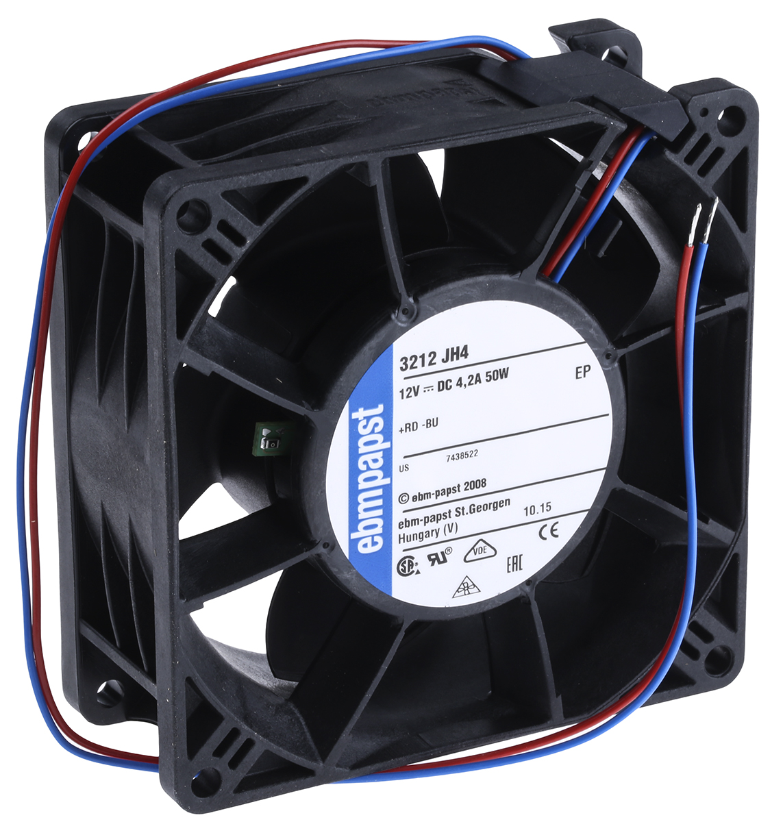 This is DC Axial Fan 92 x 92 x 38mm 280m³/h 50W 12 V dc (3200J Series) manufactured by ebm-papst. The manufacturer part number is 3212JH4. The given dimensions of the product include 92 x 92 x 38mm. It features a noise level of 73db. It operates through dc. This has integrated with a ball, a bearing with long-lasting features. In addition, the height is 92mm. Furthermore, the product is 92mm wide. The product comes in 38mm depth. Its power consumption is approximately 50w . It has a 280m³/h air flow rate. Features 12 v dc supply voltage. Its fan speed is about 13000rpm .