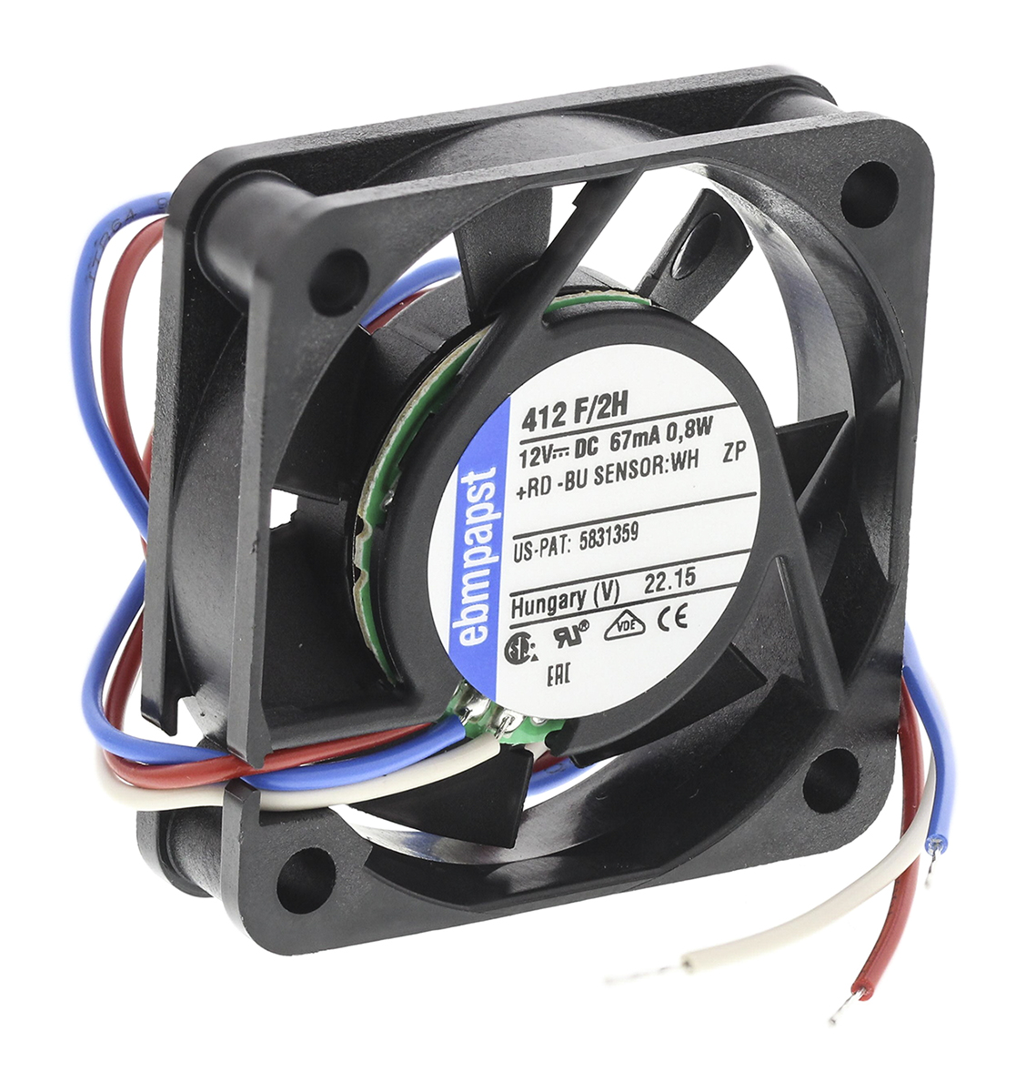 This is Axial Fan 40 x 40 x 10mm 8m³/h 700mW 12 V dc (400F Series) manufactured by ebm-papst. The manufacturer part number is 412F/2H. The given dimensions of the product include 40 x 40 x 10mm. It features a noise level of 26db(a). It operates through dc. This has integrated with a sleeve, a bearing with long-lasting features. In addition, the height is 40mm. Furthermore, the product is 40mm wide. The product comes in 10mm depth. Its power consumption is approximately 800mw . It has a 9m³/h air flow rate. Features 12 v dc supply voltage. Its fan speed is about 6000rpm . These sensors are sort of tachometer.