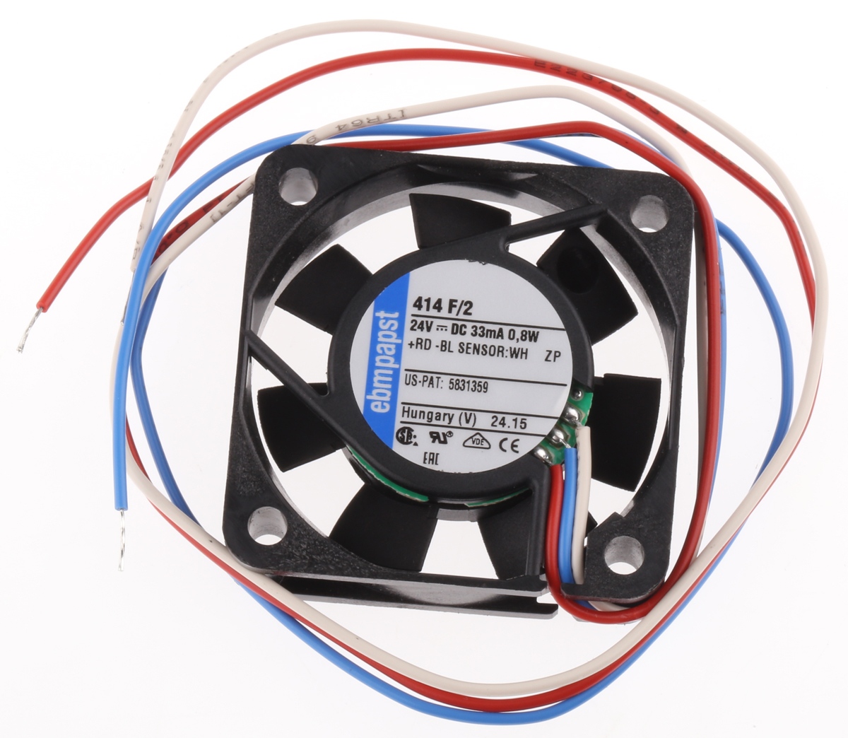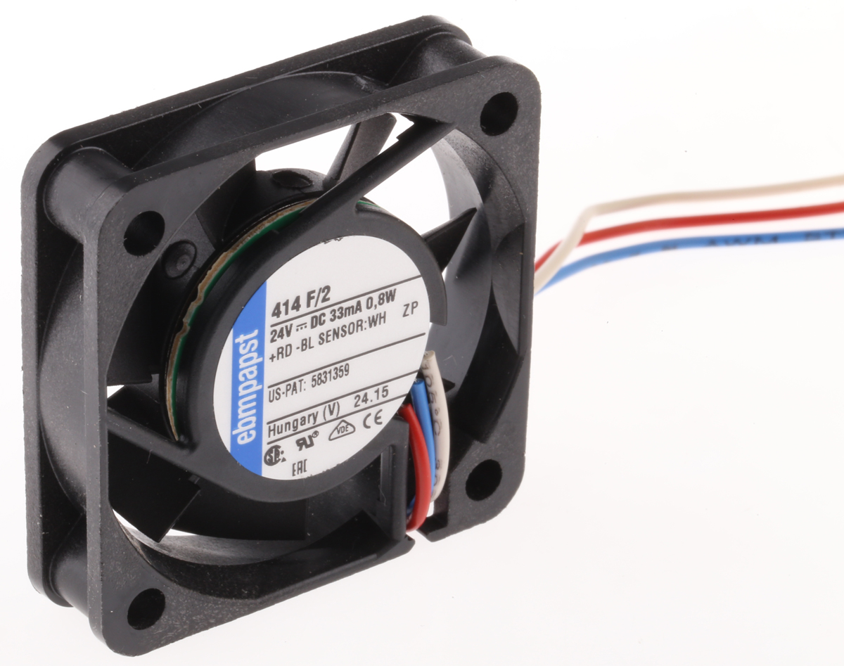 This is DC Axial Fan 40 x 40 x 10mm 8m³/h 0.8W 24 V (400F Series) manufactured by ebm-papst. The manufacturer part number is 414F/2. The given dimensions of the product include 40 x 40 x 10mm. It features a noise level of 22.1db. It operates through dc. This has integrated with a sleeve, a bearing with long-lasting features. In addition, the height is 40mm. Furthermore, the product is 40mm wide. The product comes in 10mm depth. Its power consumption is approximately 800mw . It has a 8m³/h air flow rate. Features 24 v dc supply voltage. Its fan speed is about 5400rpm . These sensors are sort of tachometer.