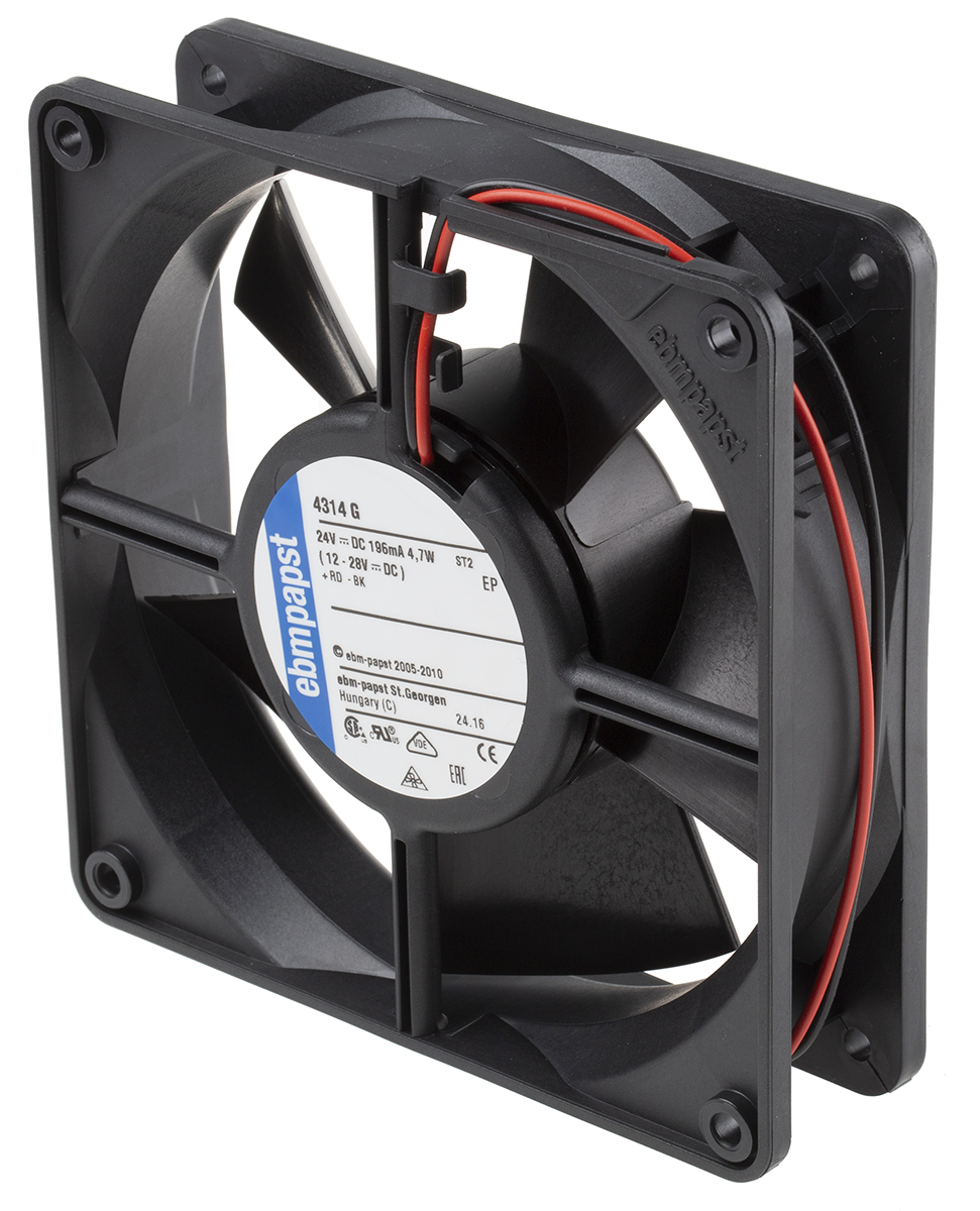 This is Axial Fan 119 x 119 x 32mm 170m³/h 5W 24 V dc (4314 Series) manufactured by ebm-papst. The manufacturer part number is 4314G. The given dimensions of the product include 119 x 119 x 32mm. It features a noise level of 45db. It operates through dc. This has integrated with a sleeve, a bearing with long-lasting features. In addition, the height is 119mm. Furthermore, the product is 119mm wide. The product comes in 32mm depth. Its power consumption is approximately 5w . It has a 170m³/h air flow rate. Features 24 v dc supply voltage. Its fan speed is about 2800rpm .