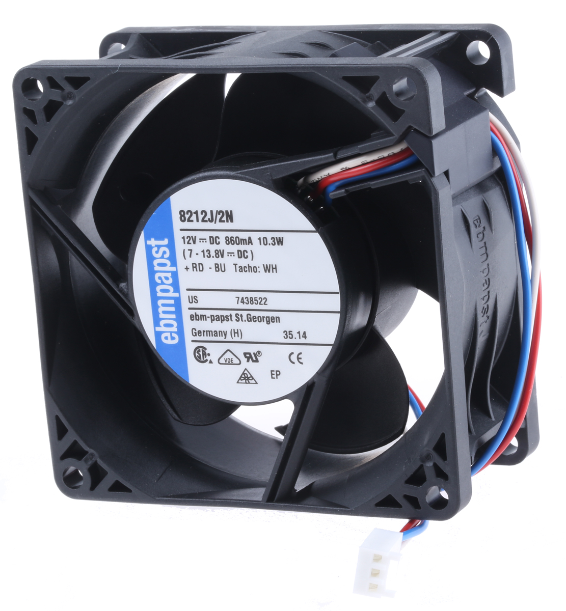 This is Axial Fan 80 x 80 x 38mm 132m³/h 10W 12 V dc (8200J Series) manufactured by ebm-papst. The manufacturer part number is 8212J/2N-RS0. The given dimensions of the product include 80 x 80 x 38mm. It features a noise level of 55db. It operates through dc. This has integrated with a ball, a bearing with long-lasting features. In addition, the height is 80mm. Furthermore, the product is 80mm wide. The product comes in 38mm depth. Its power consumption is approximately 10w . It has a 132m³/h air flow rate. Features 12 v dc supply voltage. Its fan speed is about 8400rpm . These sensors are sort of tachometer.