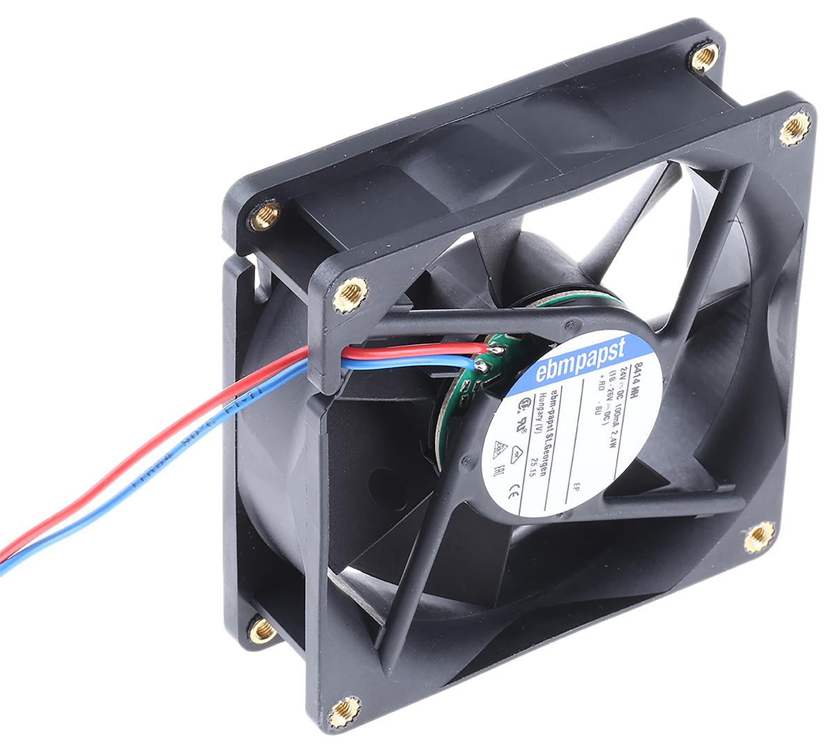 This is Axial Fan 80 x 80 x 25mm 79m³/h 2.4W 24 V dc (8400N Series) manufactured by ebm-papst. The manufacturer part number is 8414NH-RS0. The given dimensions of the product include 80 x 80 x 25mm. It features a noise level of 37db. It operates through dc. This has integrated with a ball, a bearing with long-lasting features. In addition, the height is 80mm. Furthermore, the product is 80mm wide. The product comes in 25mm depth. Its power consumption is approximately 2.4w . It has a 79m³/h air flow rate. Features 24 v dc supply voltage. Its fan speed is about 3600rpm .