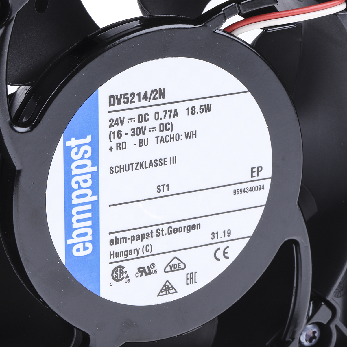 This is Axial Fan 127 x 127 x 38mm 270m³/h 20W 24 V dc (DV5200 Series) manufactured by ebm-papst. The manufacturer part number is DV5214/2N. The given dimensions of the product include 127 x 127 x 38mm. It also carries 850ma maximum current. It features a noise level of 56db. It operates through dc. This has integrated with a ball, a bearing with long-lasting features. In addition, the height is 127mm. Furthermore, the product is 127mm wide. The product comes in 38mm depth. Its power consumption is approximately 20w . It has a 270m³/h air flow rate. Features 24 v dc supply voltage. Its fan speed is about 5000rpm . These sensors are sort of tachometer.