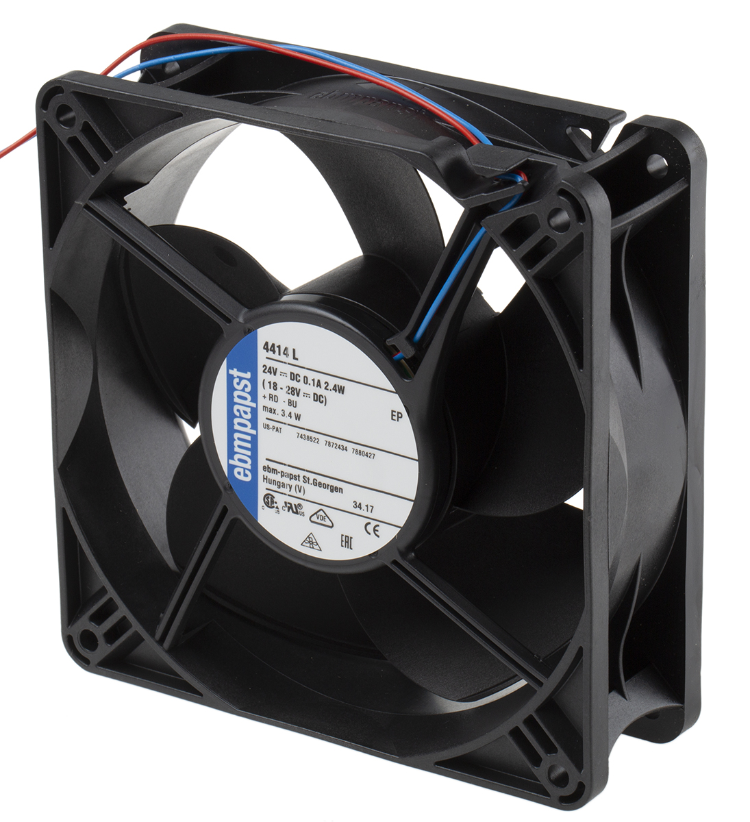 This is DC Axial Fan 119 x 119 x 38mm 150m³/h 2.5W 24 V dc (4400 Series) manufactured by ebm-papst. The manufacturer part number is 4414L. The given dimensions of the product include 119 x 119 x 38mm. It features a noise level of 37db. It operates through dc. This has integrated with a ball, a bearing with long-lasting features. In addition, the height is 119mm. Furthermore, the product is 119mm wide. The product comes in 38mm depth. Its power consumption is approximately 2.4w . It has a 150m³/h air flow rate. Features 24 v dc supply voltage. Its fan speed is about 2700rpm .