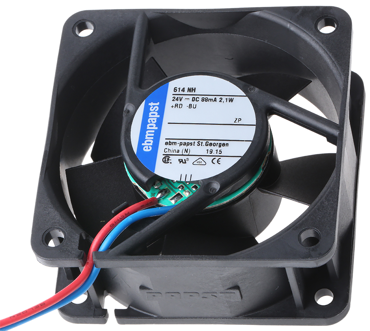 This is DC Axial Fan 60 x 60 x 25mm 43m³/h 2.1W 24 V (600N Series) manufactured by ebm-papst. The manufacturer part number is 614NH. The given dimensions of the product include 60 x 60 x 25mm. It features a noise level of 37db. It operates through dc. This has integrated with a ball, a bearing with long-lasting features. In addition, the height is 60mm. Furthermore, the product is 60mm wide. The product comes in 25mm depth. Its power consumption is approximately 2.1w . It has a 43m³/h air flow rate. Features 24 v dc supply voltage. Its fan speed is about 5600rpm .