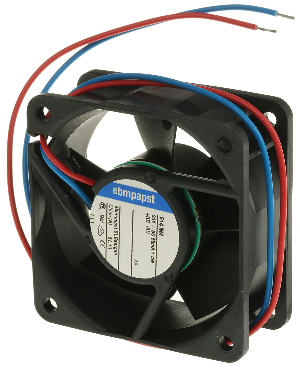 This is Axial Fan 60 x 60 x 25mm 35m³/h 1.3W 24 V dc (600 Series) manufactured by ebm-papst. The manufacturer part number is 614NM. The given dimensions of the product include 60 x 60 x 25mm. It features a noise level of 28db. It operates through dc. This has integrated with a ball, a bearing with long-lasting features. In addition, the height is 60mm. Furthermore, the product is 60mm wide. The product comes in 25mm depth. Its power consumption is approximately 1.3w . It has a 35m³/h air flow rate. Features 24 v dc supply voltage. Its fan speed is about 4100rpm .
