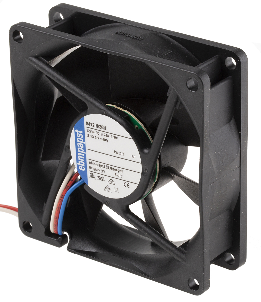 This is Axial Fan 80 x 80 x 25mm 78m³/h 2.2W 12 V dc (8400N Series) manufactured by ebm-papst. The manufacturer part number is 8412N/2GH-214. The given dimensions of the product include 80 x 80 x 25mm. It features a noise level of 37db. It operates through dc. This has integrated with a sleeve, a bearing with long-lasting features. In addition, the height is 80mm. Furthermore, the product is 80mm wide. The product comes in 25mm depth. Its power consumption is approximately 2.2w . It has a 78m³/h air flow rate. Features 12 v dc supply voltage. Its fan speed is about 3600rpm . These sensors are sort of tachometer.
