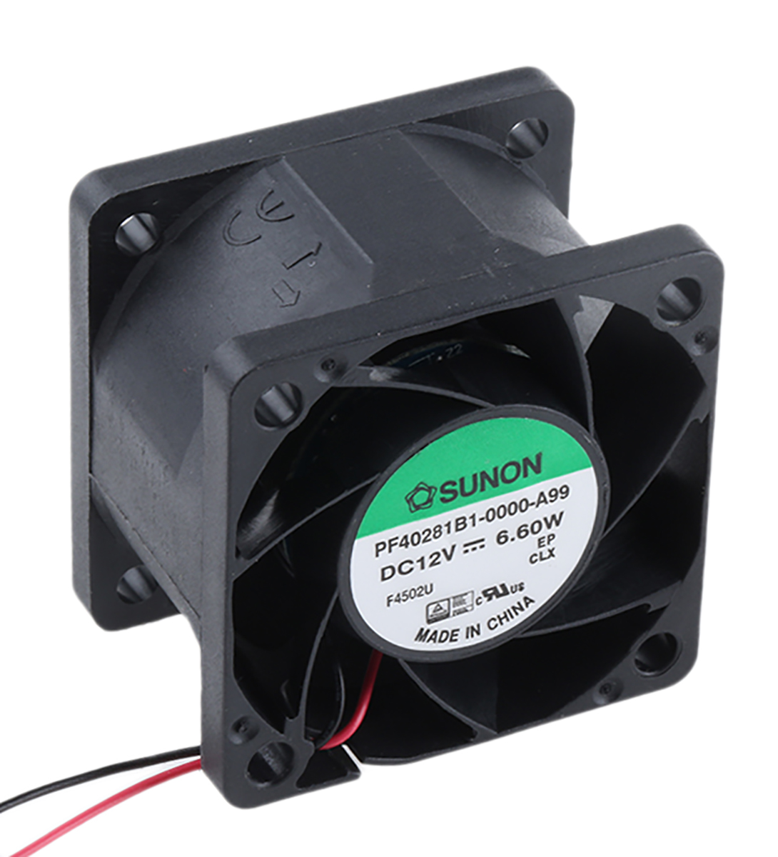 This is DC Axial Fan 40 x 28 x 40mm 42m³/h 6.12W 12 V dc (PF Series) manufactured by Sunon. The manufacturer part number is PF40281B1-0000-A99. The given dimensions of the product include 40 x 40 x 28mm. It also carries 510ma maximum current. It features a noise level of 58.8db. It operates through dc. This has integrated with a ball, a bearing with long-lasting features. In addition, the height is 40mm. Furthermore, the product is 28mm wide. The product comes in 40mm depth. Its power consumption is approximately 6.12w . It has a 42m³/h air flow rate. Features 12 v dc supply voltage. Its fan speed is about 17600rpm . Its direction of curve is in forward .