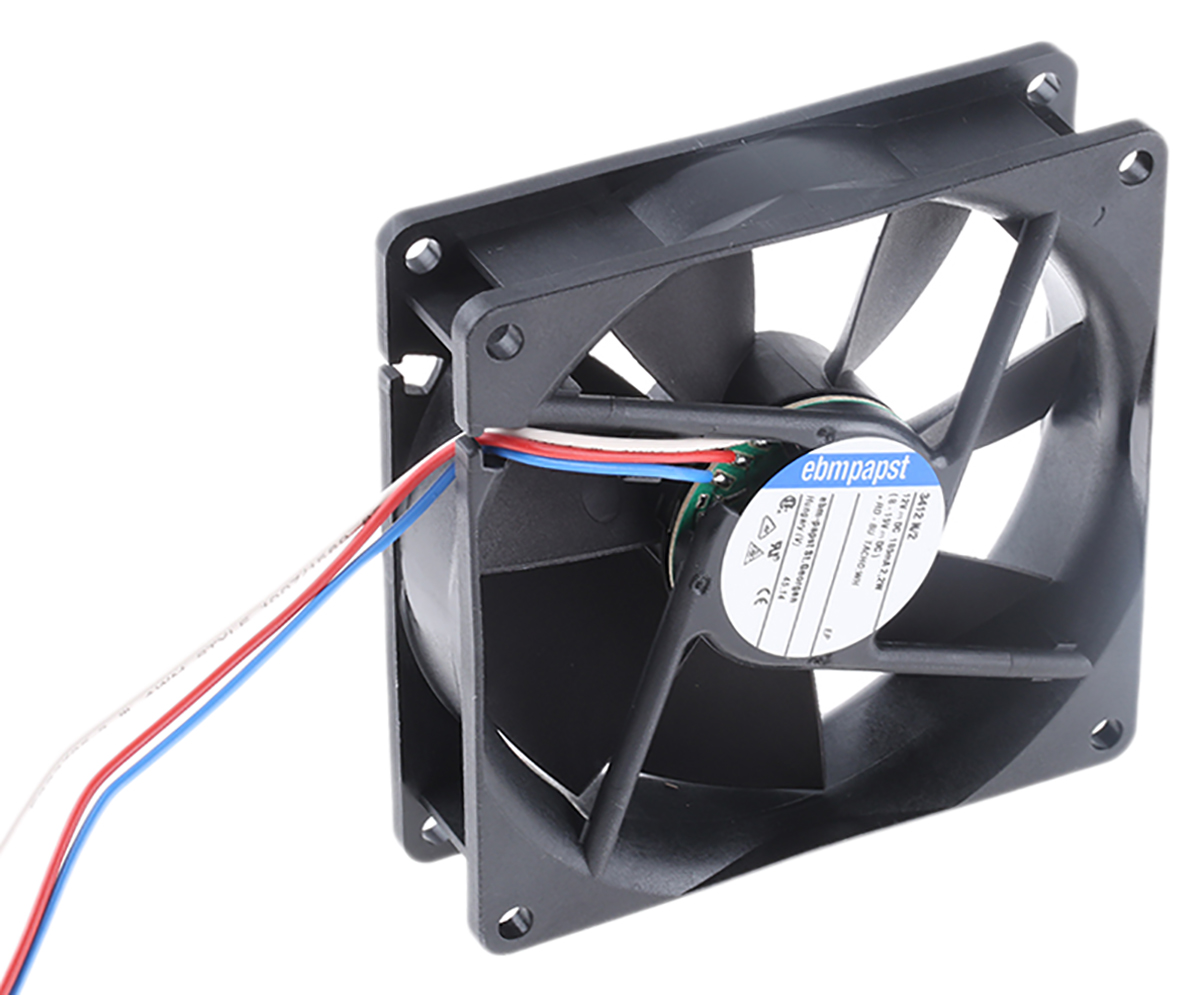 This is Axial Fan 92 x 92 x 25mm 84m³/h 2.2W 12 V dc (3400N Series) manufactured by ebm-papst. The manufacturer part number is 3412N/2. The given dimensions of the product include 92 x 92 x 25mm. It also carries 183ma maximum current. It features a noise level of 32db. It operates through dc. This has integrated with a ball, a bearing with long-lasting features. In addition, the height is 92mm. Furthermore, the product is 92mm wide. The product comes in 25mm depth. Its power consumption is approximately 2.2w . It has a 84m³/h air flow rate. Features 12 v dc supply voltage. Its fan speed is about 2700rpm . These sensors are sort of tachometer.