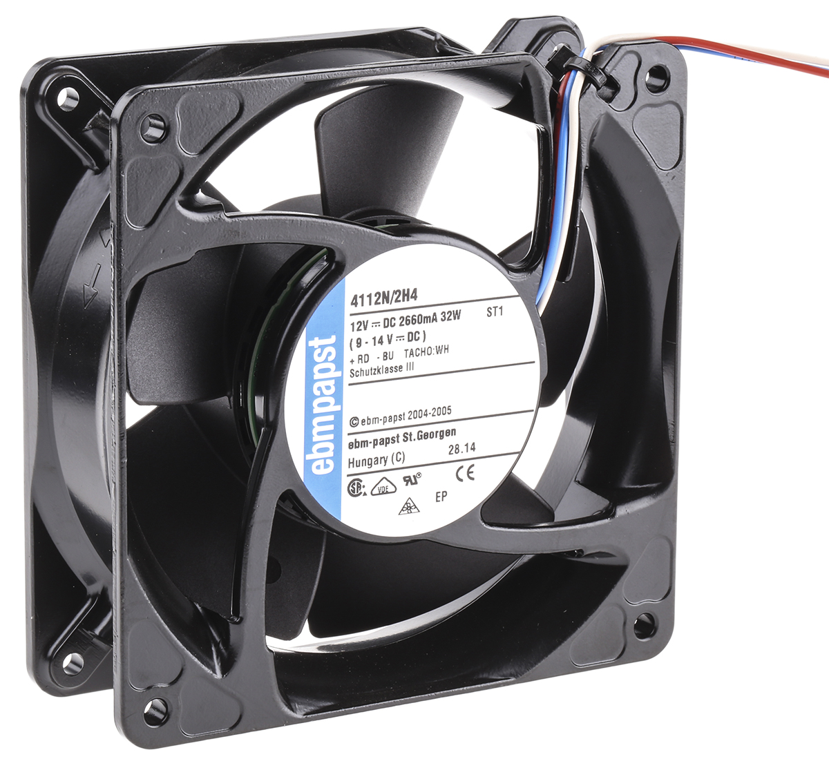 This is Axial Fan 119 x 119 x 38mm 355m³/h 32W 12 V dc (4100N Series) manufactured by ebm-papst. The manufacturer part number is 4112N/2H4-RS0. The given dimensions of the product include 119 x 119 x 38mm. It features a noise level of 67db. It operates through dc. This has integrated with a ball, a bearing with long-lasting features. In addition, the height is 119mm. Furthermore, the product is 119mm wide. The product comes in 38mm depth. Its power consumption is approximately 32w . It has a 355m³/h air flow rate. Features 12 v dc supply voltage. Its fan speed is about 6800rpm . These sensors are sort of tachometer.