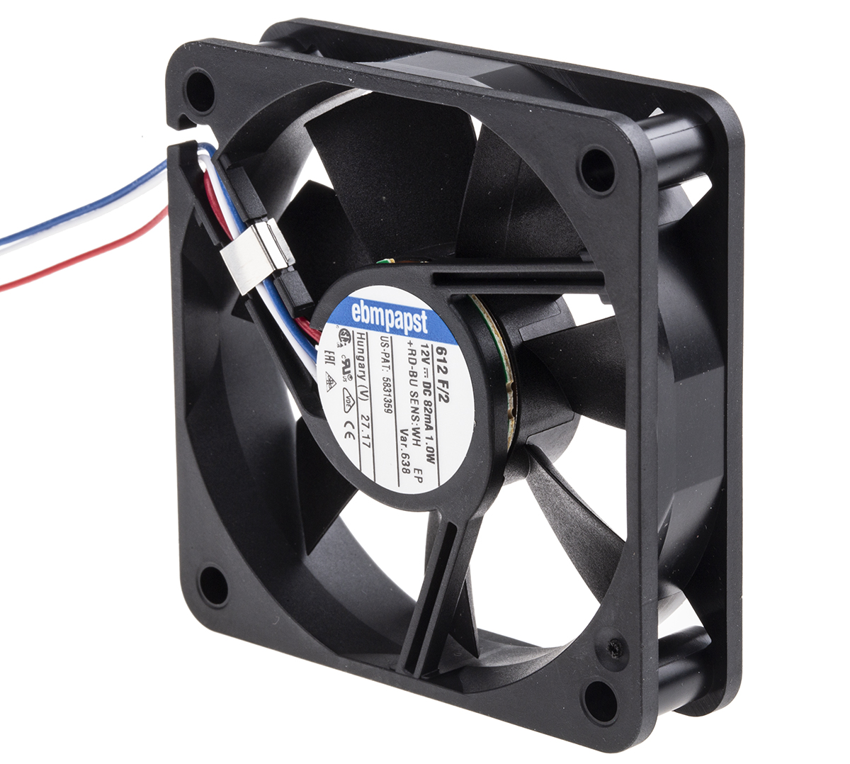 This is Axial Fan 60 x 60 x 15mm 27m³/h 1W 12 V dc (600F Series) manufactured by ebm-papst. The manufacturer part number is 612 F/2-638. The given dimensions of the product include 60 x 60 x 15mm. It features a noise level of 27db. It operates through dc. This has integrated with a ball, a bearing with long-lasting features. In addition, the height is 60mm. Furthermore, the product is 60mm wide. The product comes in 15mm depth. Its power consumption is approximately 1w . It has a 27m³/h air flow rate. Features 12 v dc supply voltage. Its fan speed is about 3900rpm . These sensors are sort of tachometer.