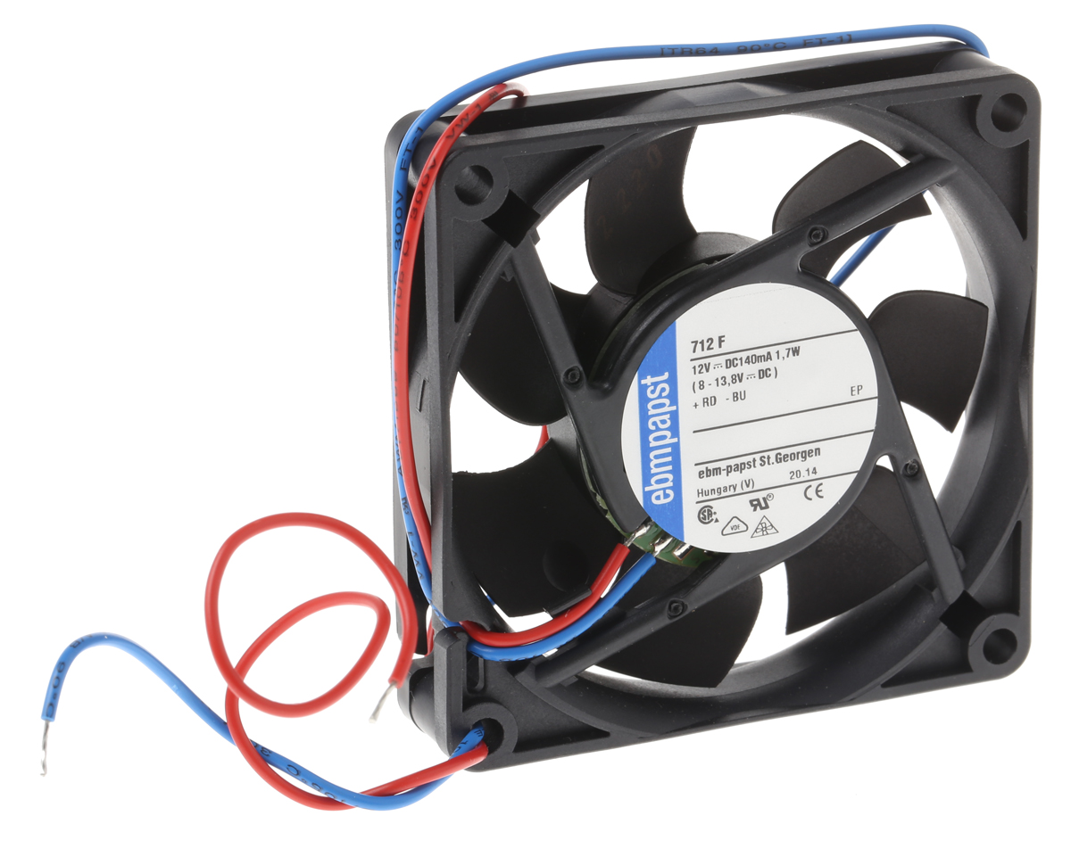 This is 700F Series Axial Fan 70 x 70 x 15mm 44m³/h 1.7W 12 V dc manufactured by ebm-papst. The manufacturer part number is 712F. The given dimensions of the product include 70 x 70 x 15mm. It also carries 142ma maximum current. It features a noise level of 38db. It operates through dc. This has integrated with a sleeve, a bearing with long-lasting features. In addition, the height is 70mm. Furthermore, the product is 70mm wide. The product comes in 15mm depth. Its power consumption is approximately 1.7w . It has a 44m³/h air flow rate. Features 12 v dc supply voltage. Its fan speed is about 5300rpm .