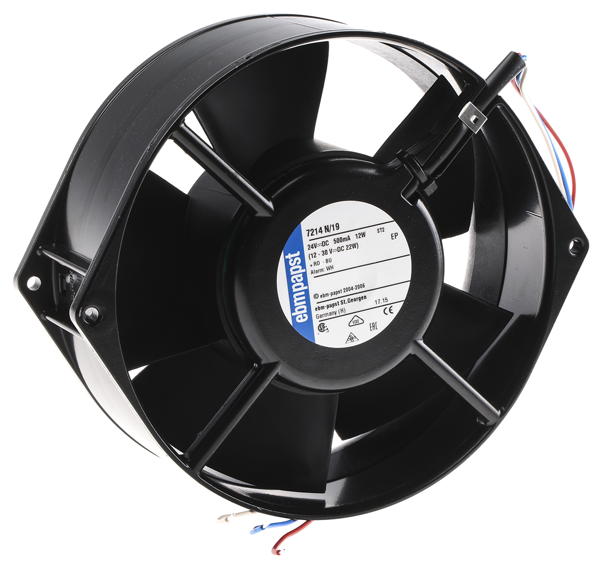 This is Axial Fan 150 x 55mm 360m³/h 12W 24 V dc (7200 Series) manufactured by ebm-papst. The manufacturer part number is 7214N/19. The given dimensions of the product include 150 x 55mm. It features a noise level of 53db. It operates through dc. This has integrated with a ball, a bearing with long-lasting features. The product comes in 55mm depth. Its power consumption is approximately 12w . It has a 360m³/h air flow rate. Features 24 v dc supply voltage. Its fan speed is about 3050rpm .