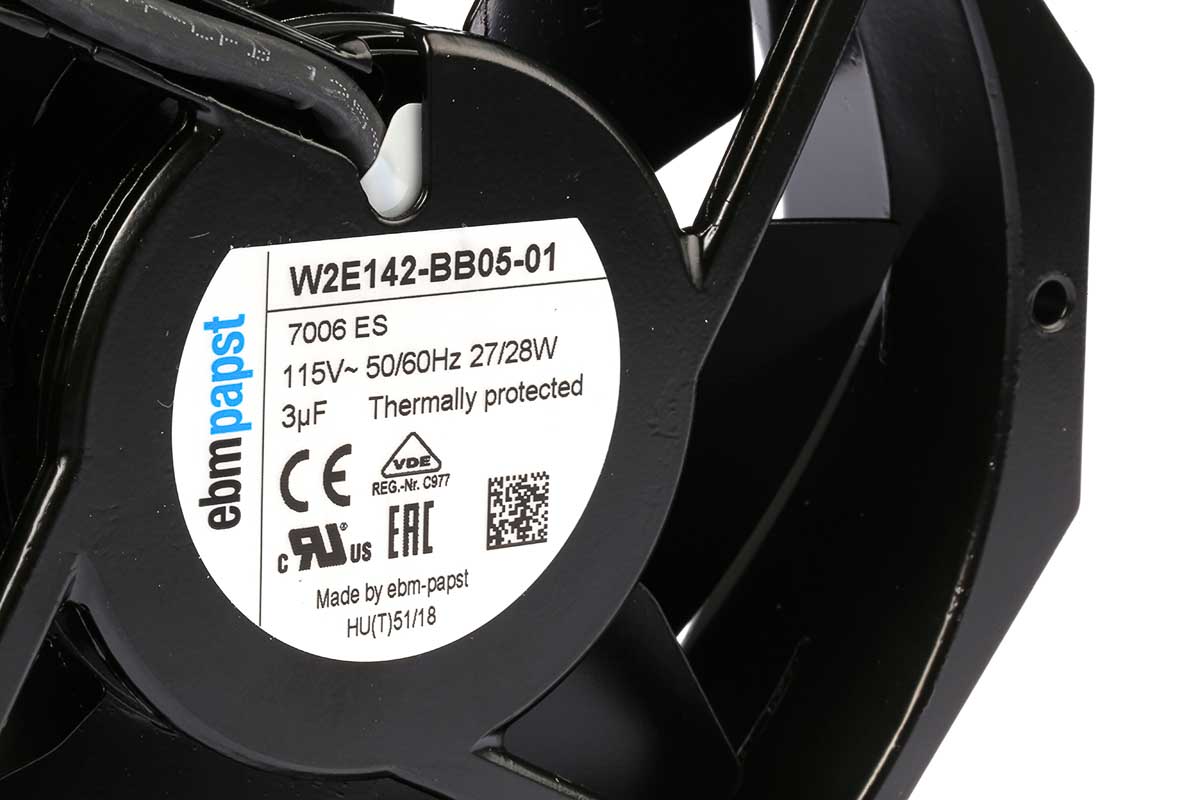 This is Axial Fan 150 x 172 x 38mm 391m³/h 24W 115 V ac (W2E142 Series) manufactured by ebm-papst. The manufacturer part number is W2E142-BB05-01. The given dimensions of the product include 172 x 150 x 38mm. It also carries 235ma maximum current. It features a noise level of 52db. It operates through ac. This has integrated with a ball, a bearing with long-lasting features. In addition, the height is 150mm. Furthermore, the product is 172mm wide. The product comes in 38mm depth. Its power consumption is approximately 27 → 28w . It has a 330m³/h air flow rate. Features 115 v ac supply voltage. Its fan speed is about 2800rpm .