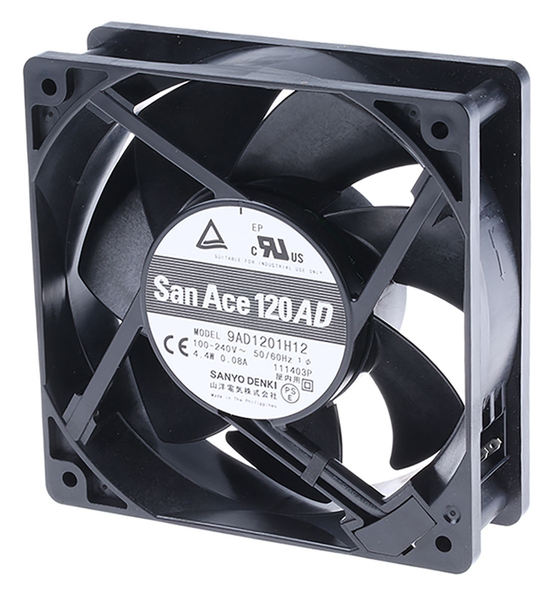 This is Axial Fan 120 x 120 x 38mm 180m³/h 4.4W 100 → 240 V ac (San Ace 9AD Series) manufactured by Sanyo Denki. The manufacturer part number is 9AD1201H12. The given dimensions of the product include 120 x 120 x 38mm. It also carries 80ma maximum current. It features a noise level of 42db. It operates through ac. This has integrated with a ball, a bearing with long-lasting features. In addition, the height is 120mm. Furthermore, the product is 120mm wide. The product comes in 38mm depth. Its power consumption is approximately 4.4w . It has a 180m³/h air flow rate. Features 100 → 240 v ac supply voltage. The product is designed with a lead wire termination. Its fan speed is about 3250rpm .