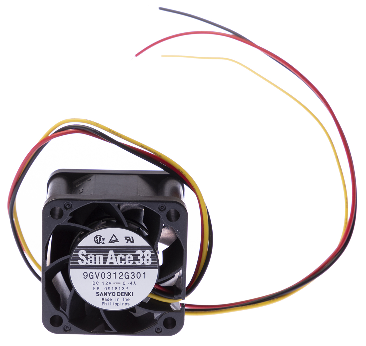 This is San Ace 9GV Series Axial Fan 38 x 38 x 28mm 28.8m³/h 4.8W 12 V dc manufactured by Sanyo Denki. The manufacturer part number is 9GV0312G301. The given dimensions of the product include 38 x 38 x 28mm. It also carries 400ma maximum current. It features a noise level of 50db. It operates through dc. This has integrated with a ball, a bearing with long-lasting features. In addition, the height is 38mm. Furthermore, the product is 38mm wide. The product comes in 28mm depth. Its power consumption is approximately 4.8w . It has a 28.8m³/h air flow rate. Features 12 v dc supply voltage. The product is designed with a lead wire termination. Its fan speed is about 13500rpm . These sensors are sort of tachometer.