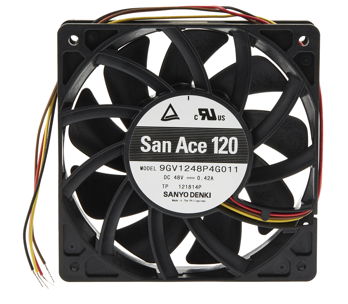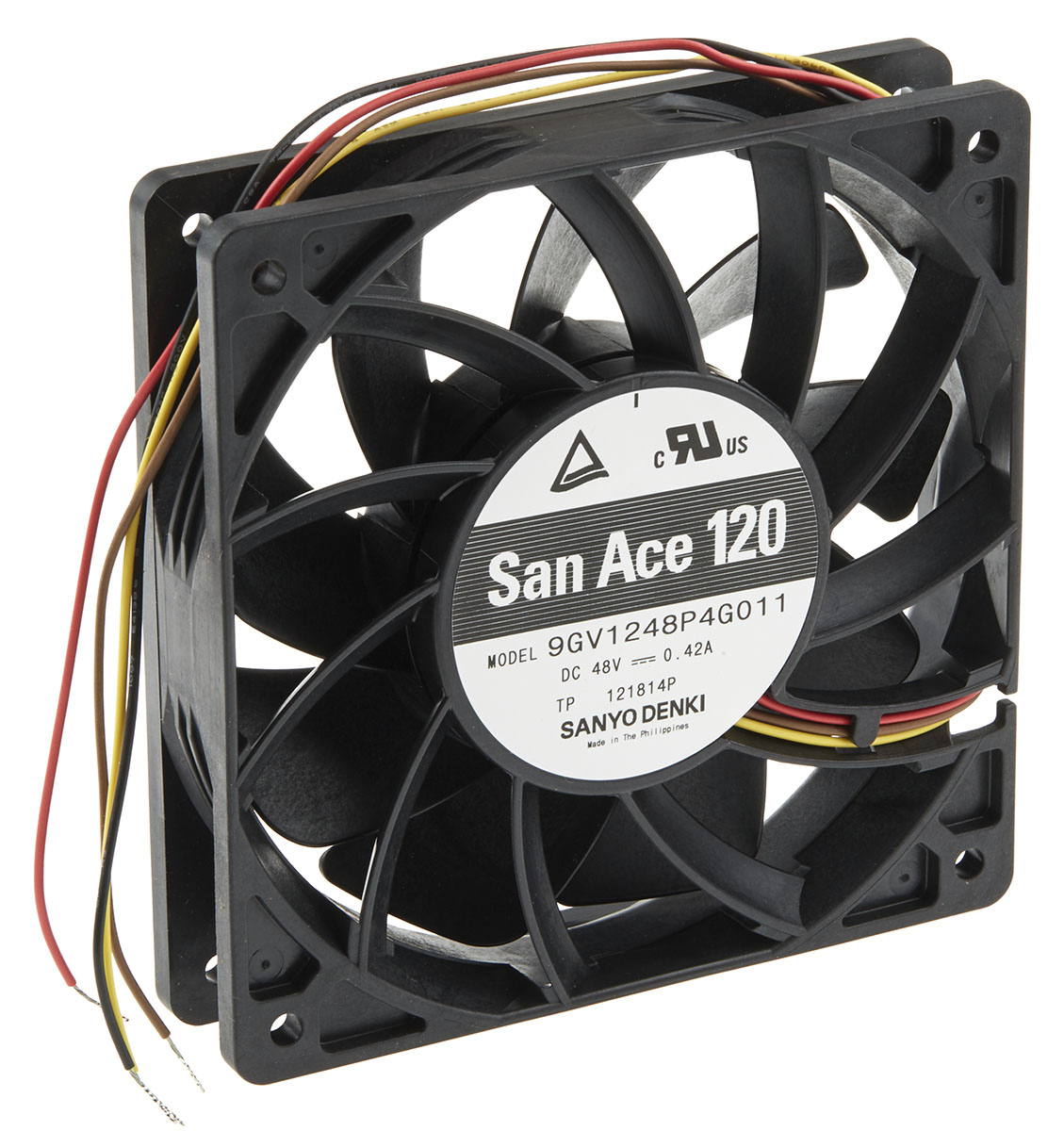 This is San Ace 9GV Series Axial Fan 120 x 120 x 25mm 289.8m³/h 20.16W 48 V dc manufactured by Sanyo Denki. The manufacturer part number is 9GV1248P4G011. The given dimensions of the product include 120 x 120 x 25mm. It also carries 420ma maximum current. It features a noise level of 58db. It operates through dc. This has integrated with a ball, a bearing with long-lasting features. In addition, the height is 120mm. Furthermore, the product is 120mm wide. The product comes in 25mm depth. Its power consumption is approximately 20.16w . It has a 289.8m³/h air flow rate. Features 48 v dc supply voltage. The product is designed with a lead wire termination. Its fan speed is about 5100rpm . These sensors are sort of pwm, tachometer.