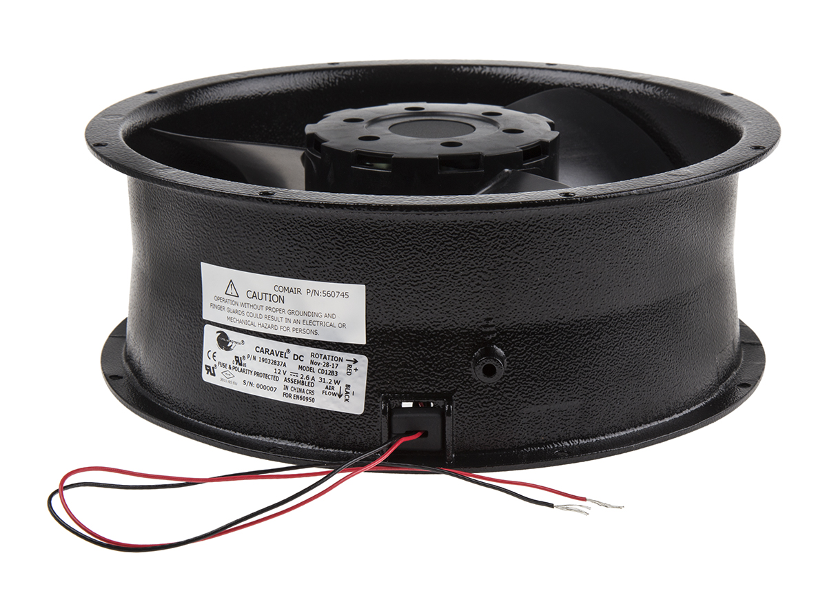 This is CD12B3 Series Axial Fan 254 x 254 x 88.9mm 548cfm 31.2W 12 V dc manufactured by COMAIR ROTRON. The manufacturer part number is CD12B3 19032837A. The given dimensions of the product include 254 x 254 x 89mm. It also carries 2.6a maximum current. It features a noise level of 49.1db. It operates through dc. This has integrated with a ball, a bearing with long-lasting features. In addition, the height is 254mm. Furthermore, the product is 254mm wide. The product comes in 88.9mm depth. Its power consumption is approximately 31.2w . It has a 931m³/h air flow rate. Features 12 v dc supply voltage. The product is designed with a lead wire termination. Its fan speed is about 1650rpm .