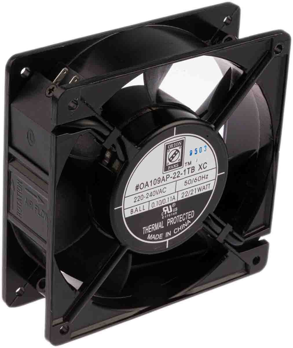 This is Axial Fan 120 x 120 x 38mm 110 cfm @ 50 Hz 131 cfm @ 60 Hz 21W 230 V ac manufactured by RS Pro. The manufacturer part number is 144-4138. The given dimensions of the product include 120 x 120 x 38mm. It also carries 100ma maximum current. It features a noise level of 47db. It operates through ac. This has integrated with a ball, a bearing with long-lasting features. In addition, the height is 120mm. Furthermore, the product is 120mm wide. The product comes in 38mm depth. Its power consumption is approximately 22w . It has a 222.6m³/h air flow rate. Features 230 v ac supply voltage. The product is designed with a faston connector termination. Its fan speed is about 3300rpm . Its direction of curve is in forward .