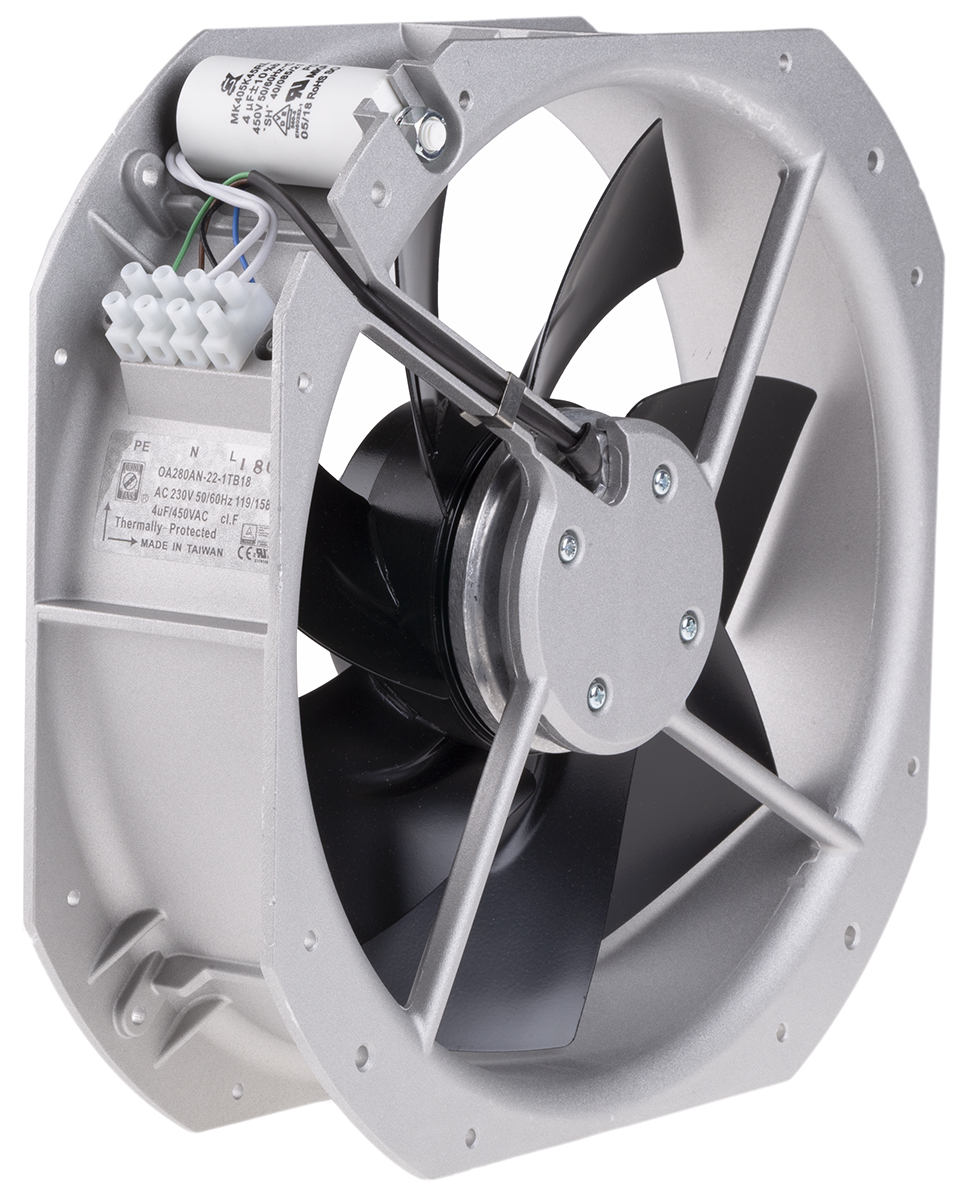 This is AC FAN 280X80 230V BALL 1130cfm manufactured by RS Pro. The manufacturer part number is 175-9820. The given dimensions of the product include 280 x 280 x 80mm. It also carries 0.82a maximum current. It is IP rated with ip55. It features a noise level of 70db. This has integrated with a ball, a bearing with long-lasting features. In addition, the height is 280mm. Furthermore, the product is 280mm wide. The product comes in 80mm depth. Its power consumption is approximately 158w . It has a 1919.9m³/h air flow rate. Features 230 v ac supply voltage. The product is designed with a lead wire termination. Its fan speed is about 2700rpm . It operates through ac. Its direction of curve is in forward .