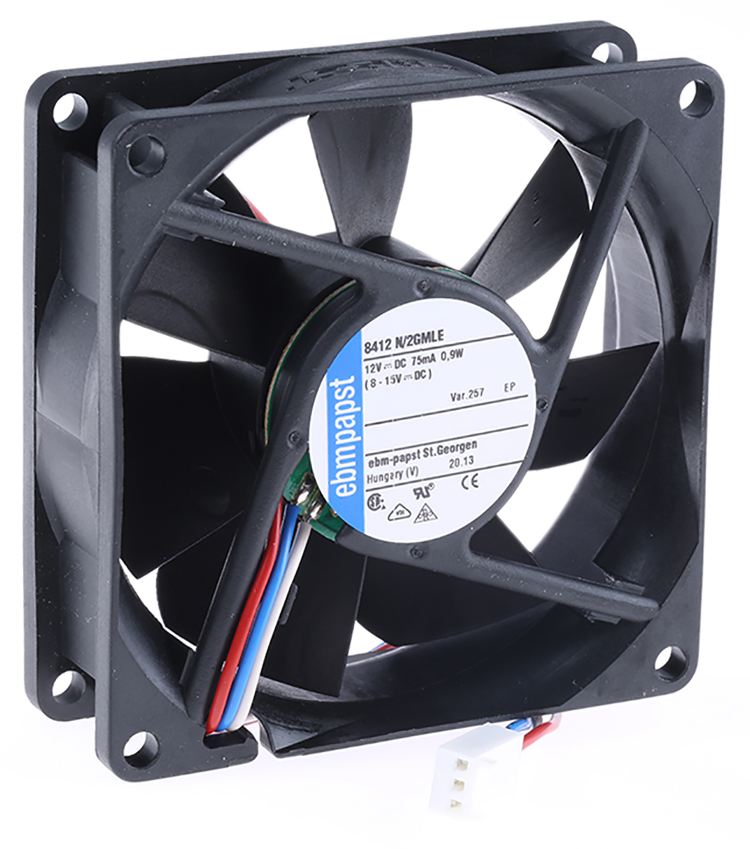 This is 8400 N Series Axial Fan 12 V dc DC Operation 45m³/h 900mW 80 x 80 x 25mm manufactured by ebm-papst. The manufacturer part number is 8412 N/2GMLE-257. The given dimensions of the product include 80 x 80 x 25mm. It features a noise level of 21db. It operates through dc. This has integrated with a sleeve, a bearing with long-lasting features. In addition, the height is 80mm. Furthermore, the product is 80mm wide. The product comes in 25mm depth. Its power consumption is approximately 900mw . It has a 45m³/h air flow rate. Features 12 v dc supply voltage. Its fan speed is about 2050rpm . These sensors are sort of tachometer.