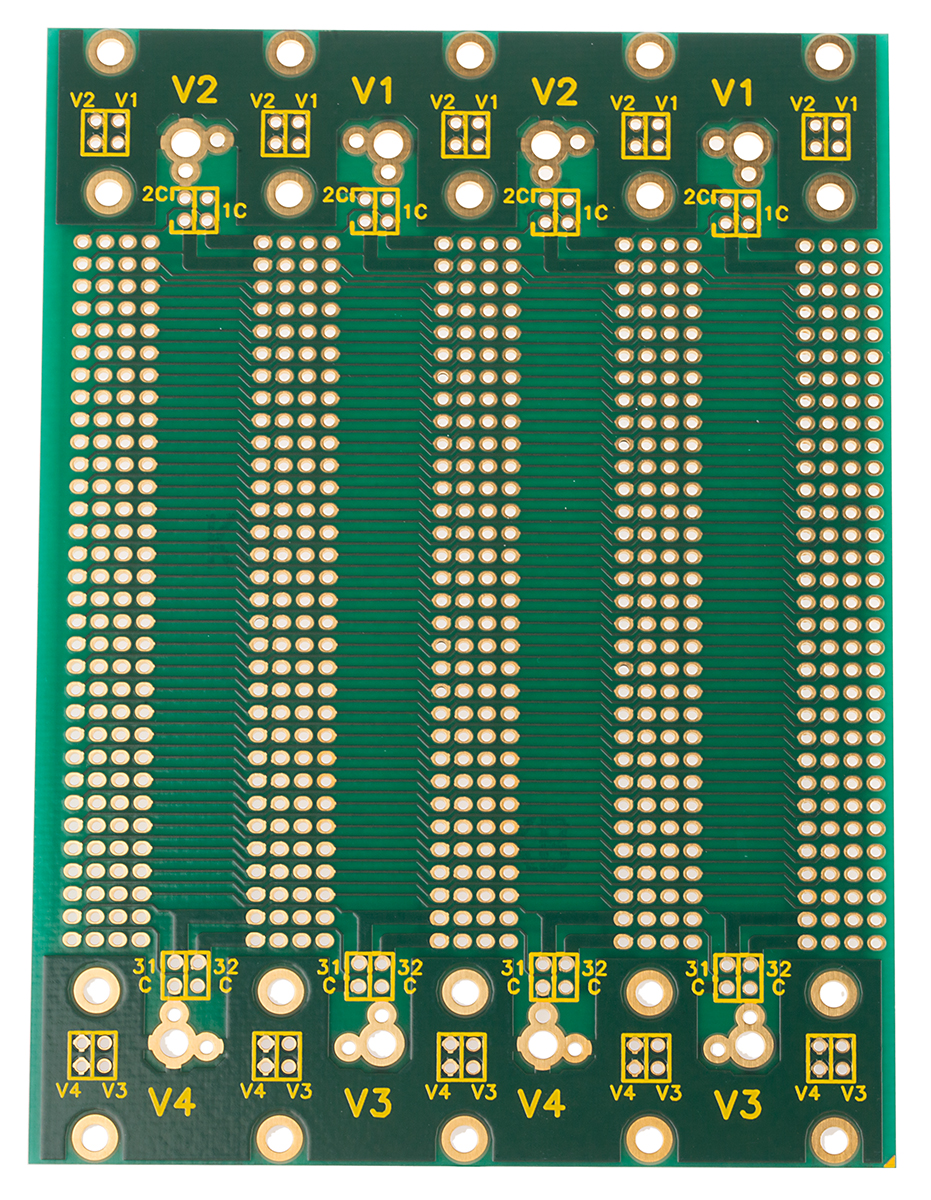 Double-Sided, Non-Allocated Motherboards Complete flexibility of positioning of Vdc or earthing. Four voltage lines available. Option to connect power supply using 6.3 mm terminal type faston or M3 thread. Choice of various widths and pitches of connectors. Row b can be used as a 0 V reserve line, in order to minimise crosstalk on rows a and c. Contacts 1, 2, 31 and 32 are allocated via a 2.54 mm pitch connection. Other contacts can be allocated by wiring or wrapping. Rows a, b and c can be connected together using strap connectors (designed to connect DIN connector pins). Boards feature high-quality foil laminate holes with varnish to avoid solder bridges. Material: epoxy glass in accordance with BS 4584 EP-GC-CU-3 (FR4) Nominal thickness: 1.6 mm Track thickness: 35 μm Coating: - copper: 25 μm - tin plating: 8 μm Self-extinguishing capability (empty board): UL 94-V0 Stock type Pitch number Length width no. connectors (mm) of positions (mm) (mm) 110-2523 96 / 96 20.32 21 420.8 128.6 110-2539 96 / 96 20.32 10 212.5 128.6 110-2545 96 / 96 20.32 5 95.7 128.6 156-7885 96 / 96 15.24 28 425.9 128.6 508-0893 96 / 96 15.24 14 212.5 128.6 PC / VME Bus Boards PC Compatible Prototyping Boards Prototyping boards manufactured from epoxy glass material to BS 4584 part 3 or 16. Card thickness is 1.6 mm. Copper is 305 g/m (1 oz/ft). Edge connector fingers are gold plated to a thickness of 1.5 microns. 1.0 mm (0.040 in.). Diameter holes are pre-drilled on a 2.54 mm (0.1 in.) matrix. Microboard Pattern Incorporates, on the component side of the card, a colander ground plane for maximum screening and glitch free high speed operation, and complete solder mask protection.